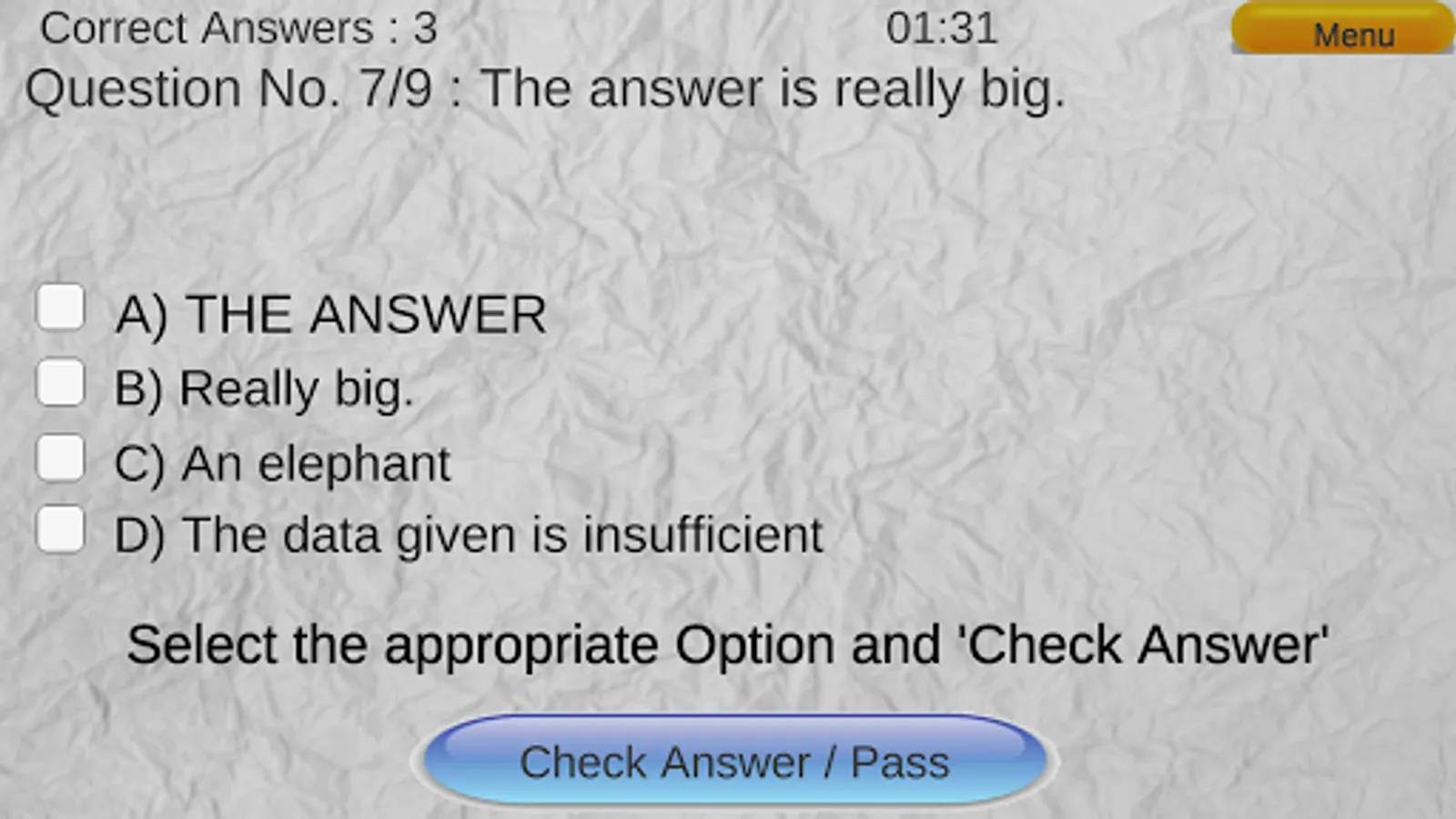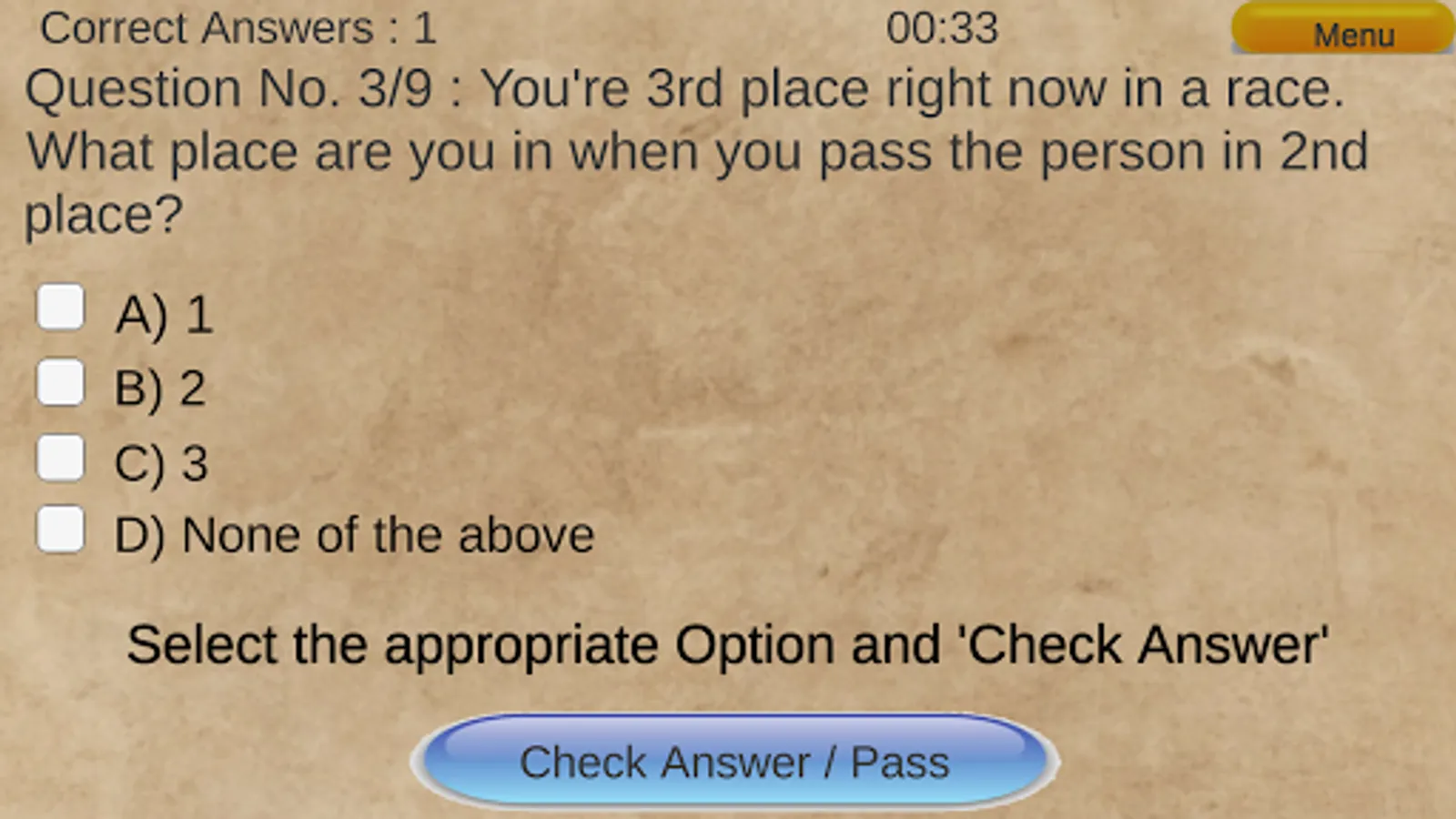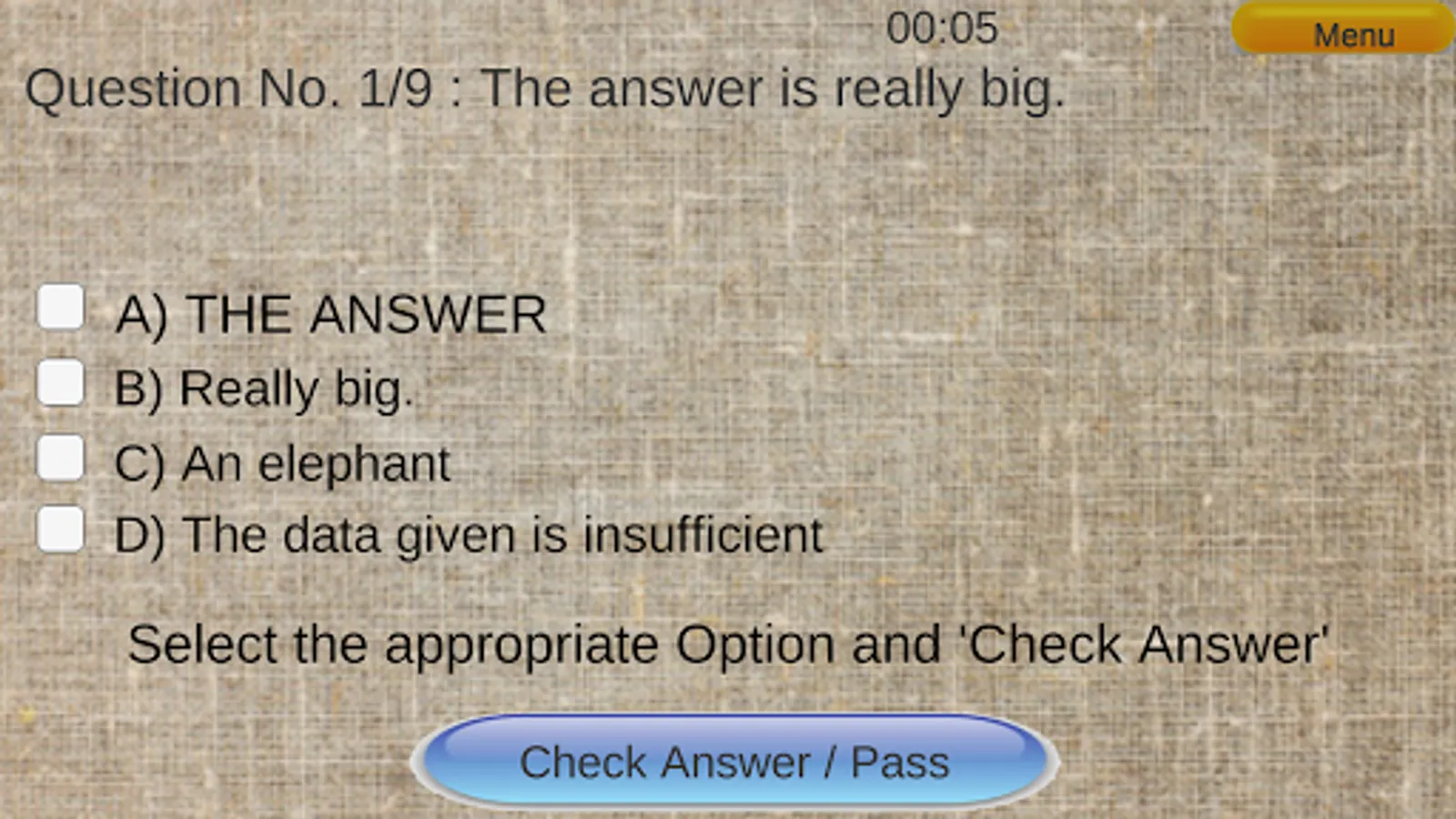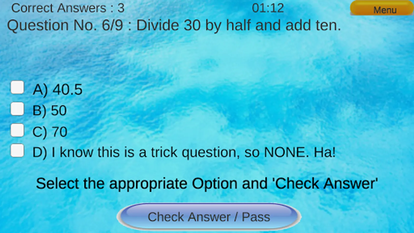 Brain Teaser Multiple questions and answers. This App actually a test starter with very few but tricky questions. Random order each time.