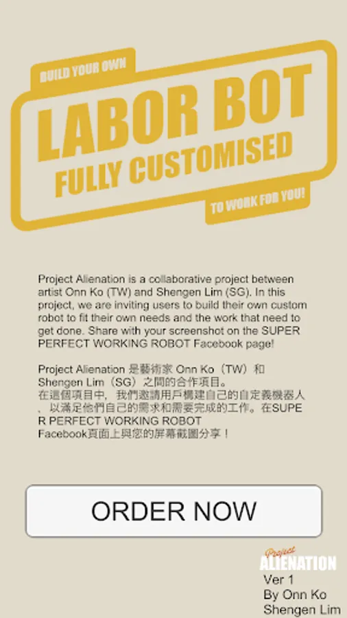 Project Alienation is a collaborative project between artist Ko Tzu-An (TW) and Shengen Lim (SG). In this project, we are using AR to bring Taiwanese artist Ko Tzu-An's labor bot to the physical space in a digital form.