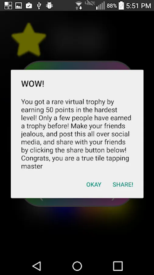 But wait...there's a surprise...IF you unlock level three, AND get a score of 50 or more, you have the chance to win a trophy! It is a huge accomplishment to win this, and so Tile Tap gives you easy share functionality to share you're win with your friends through all kinds of social media. Here are a few sources you can use to share your score and trophy: