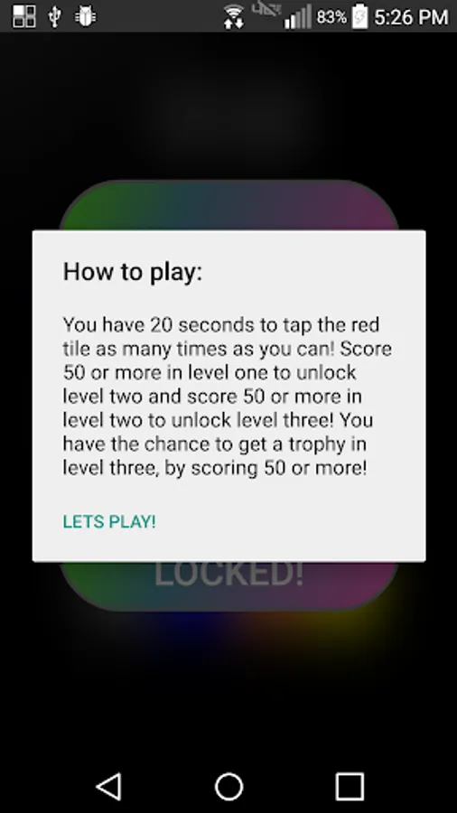 There will be one red tile, and many other colored tiles. The red tile moves around randomly, until the twenty second timer runs out. You are racing time. If you accidentally hit a tile that isn't red...YOU LOSE! There are three levels, ranging from lowest to highest difficulty, and you must get a good score in the previous level to unlock the next. Time to bump it up a notch: IF you get an outstanding score in Level Three...you can earn a RARE TROPHY...but, you must score at least 50 points in the hardest level (which is hard!)...Can you handle it?