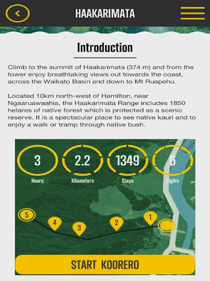 The Haakarimata Summit Track which the application is based on, is a track that comprises of a 1349 step staircase to the summit at 374 metres. Upon conquering the uphill climb people will enjoy breath-taking views, across the Waikato Basin and down to Mount Ruapehu in central North Island.
