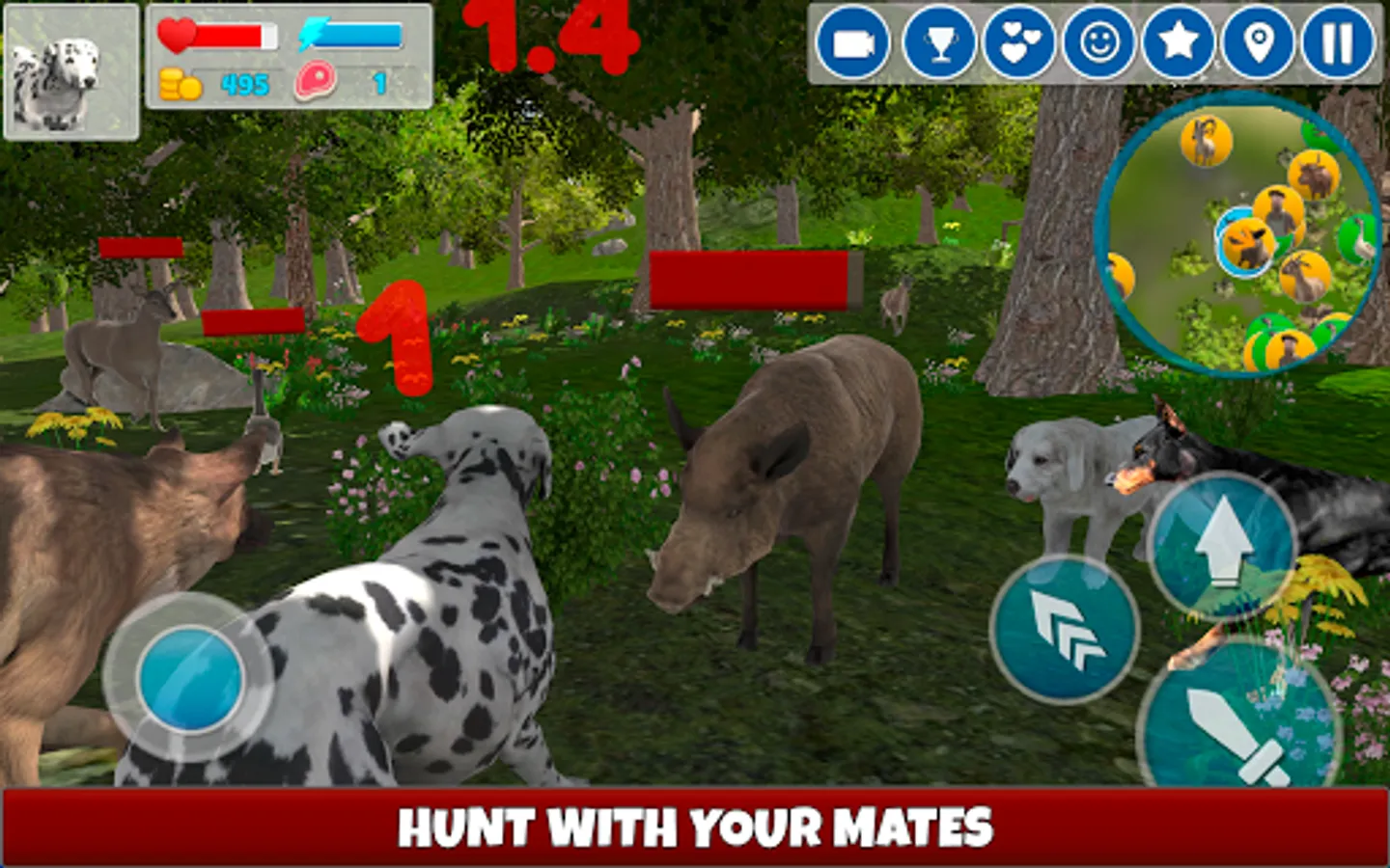 In the Dog Simulator you will travel through the game world with one of the pets you have chosen. You can make your pack of dogs and hunt animals. Also, you can make a family and improve the characteristics of each member of the pack. There are many different tasks in the large open world, you never get bored. In addition, your pack of dogs has its own house, in which you can buy different buildings.