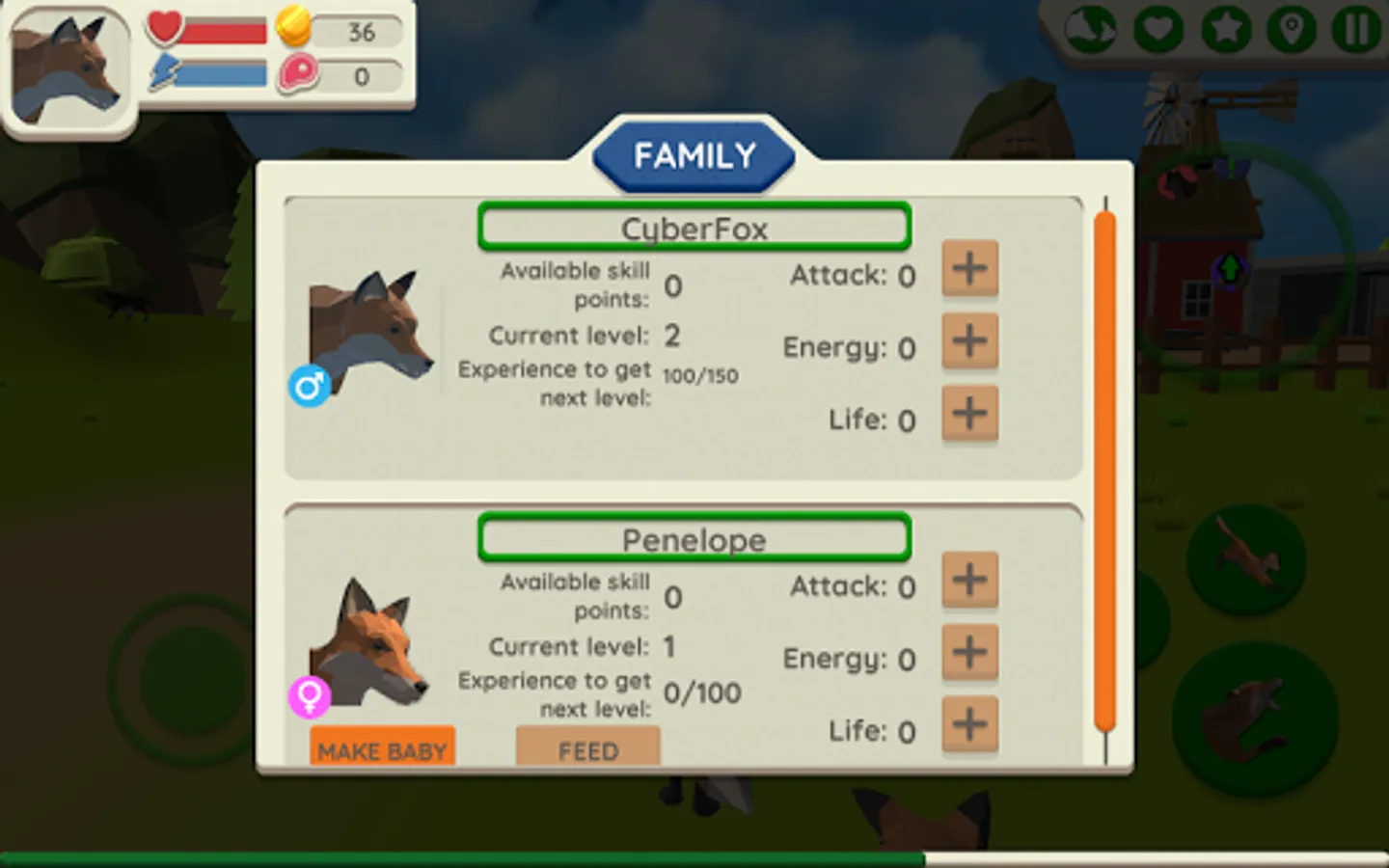 You can create a family if you find another fox. When you create a family and become an experienced fox, you will be able to make babies. Your family can help you in combat and hunting. There is an opportunity to improve the characters of the family. To do this, it is necessary to hunt and collect food in order to feed the children and the wife (the husband, for the female character) in the future.