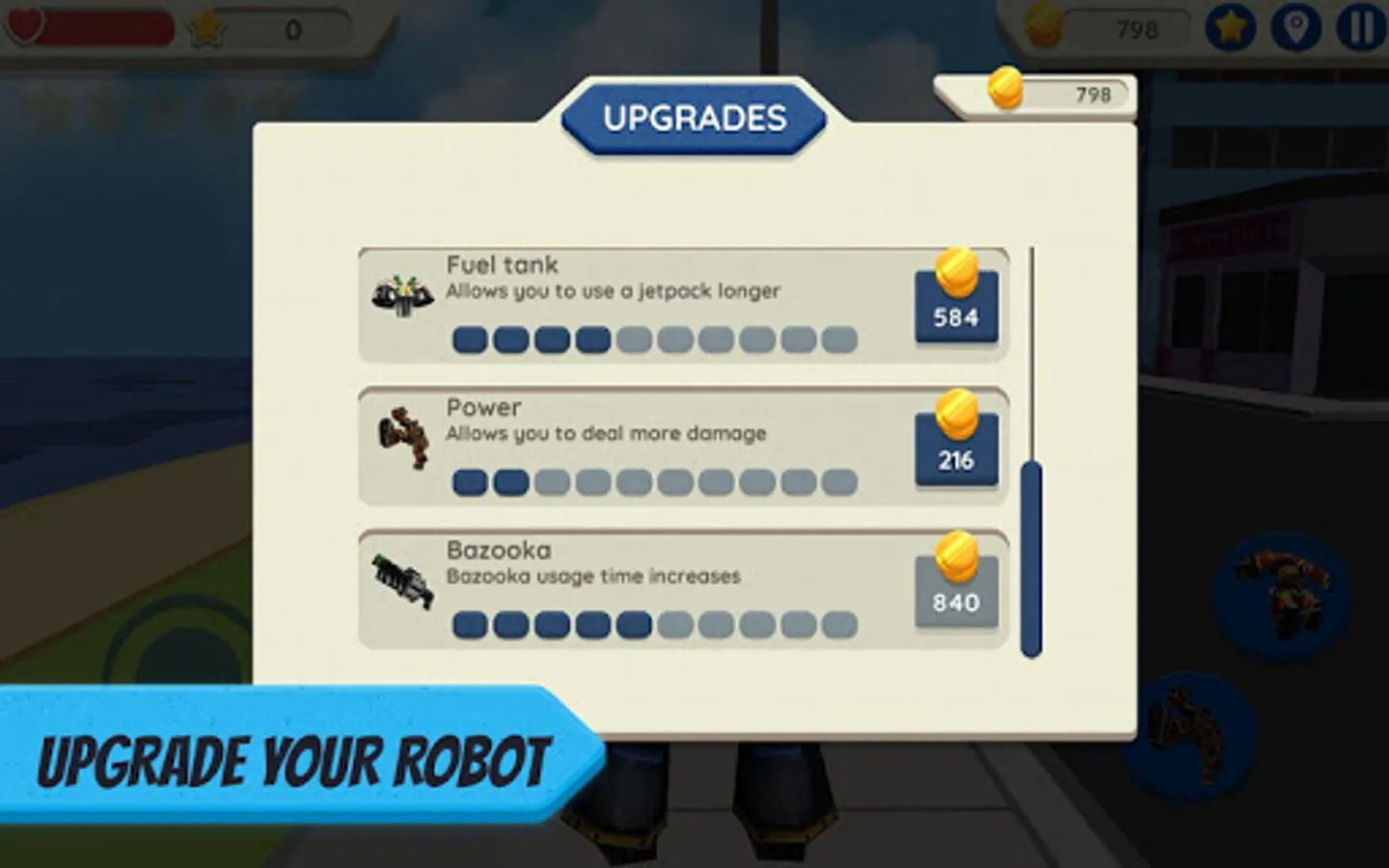 The robot will complete many exciting tasks. He will fly over the city with a jet pack, shoot from the bazooka, escape from the police and the military. In order to survive in the city, the robot has such weapons as a giant hammer, ax, spear, sword and other weapons. A lot of upgrades are available to the robot. For example, you can upgrade strength, life points, speed, obtaining bonus points and coins, jet pack and bazooka using time.