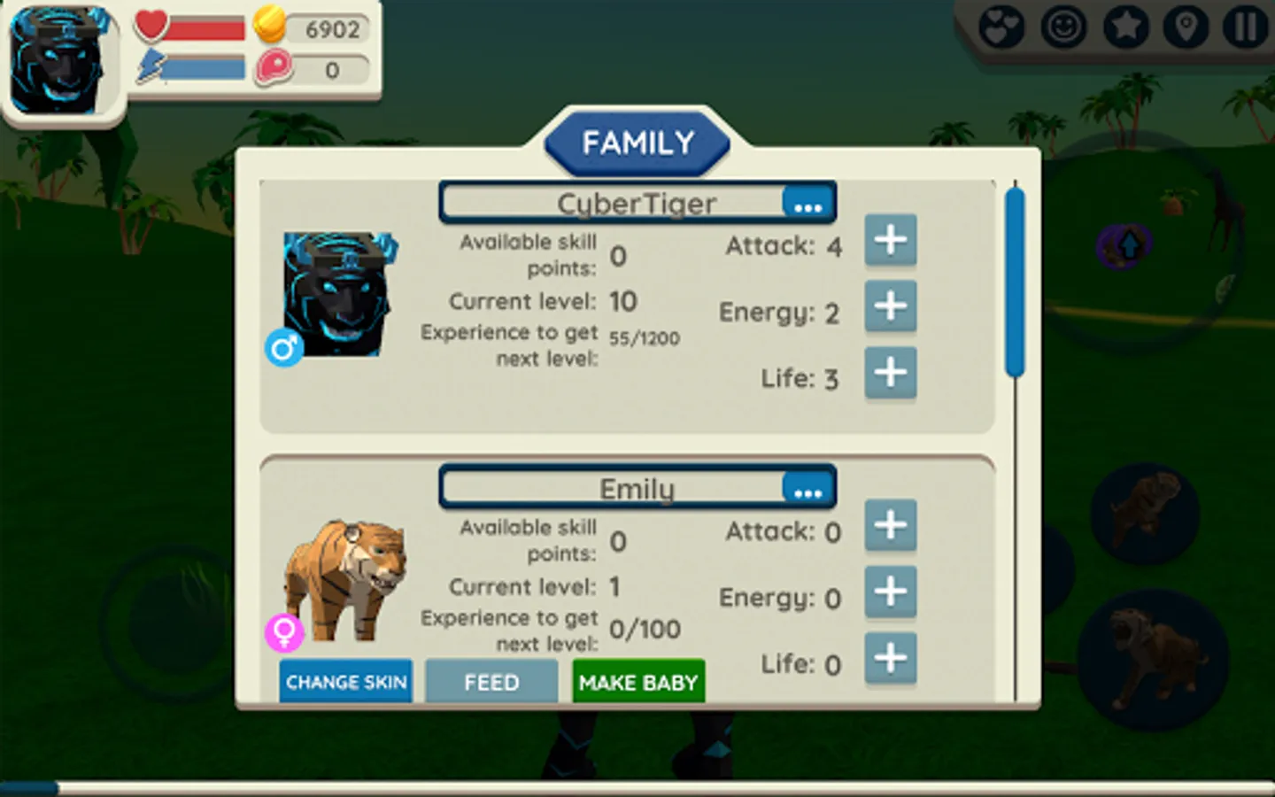 There is an opportunity to improve the individual characteristics of family members and characteristics that affect all tigers in the family at once. Do not forget to improve the characters! Get experience doing tasks and hunting. After receiving a level, the character can spend it on points of attack, energy or life. There are also special skills that allow you to increase speed, collect more food, get more resources for actions in the game, etc.