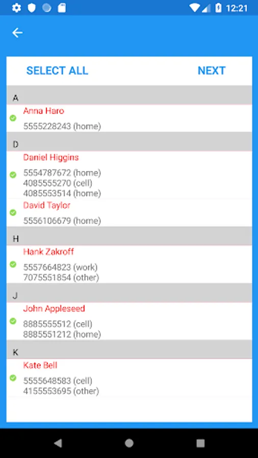 1-App to App transfer (needs app to be installed on both phones) simply tap pick your contacts you want to send and tap send and you will be given a reference ID, you enter the ID on the destination phone and contacts will be transferred instantly.