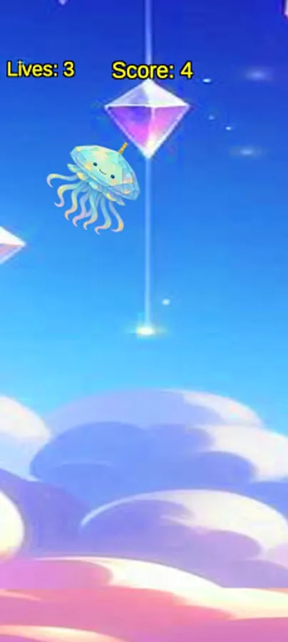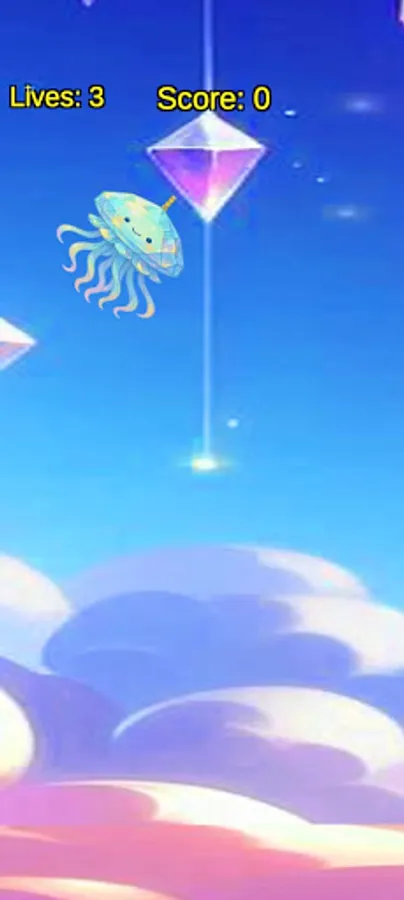 A cute crystal jellyfish swings by a golden chain in the sky.