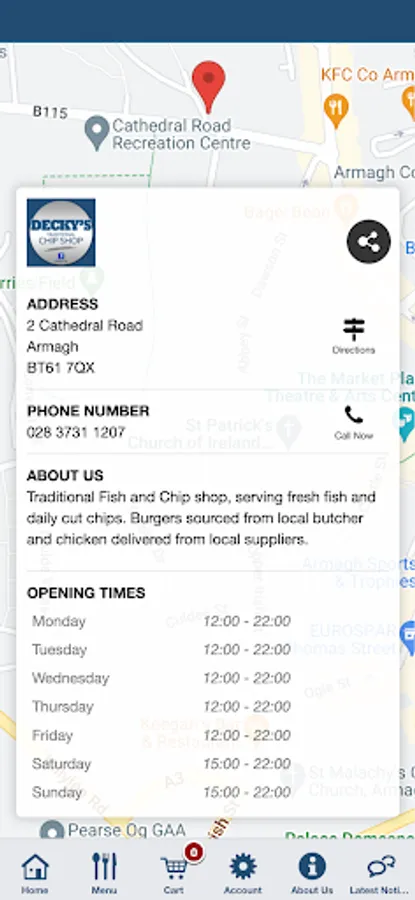 Traditional Fish and Chip shop, serving fresh fish and daily cut chips. Burgers sourced from local butcher and chicken delivered from local suppliers.