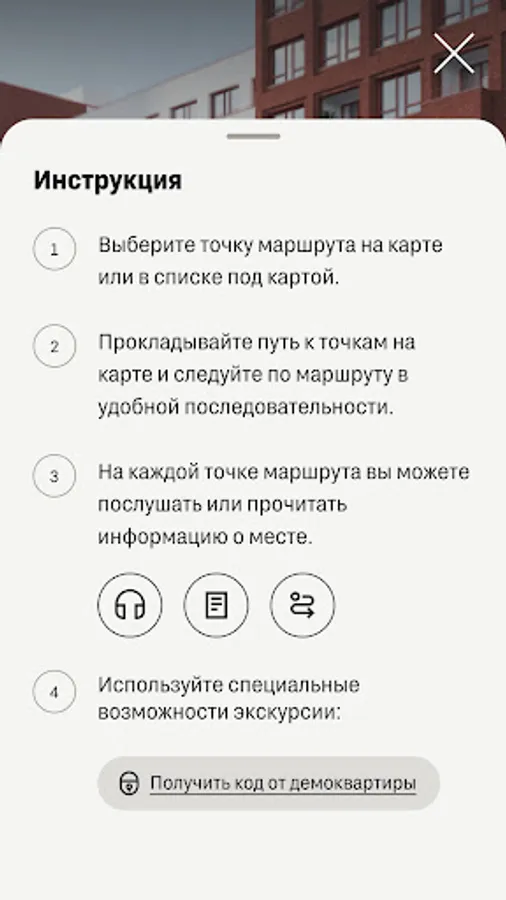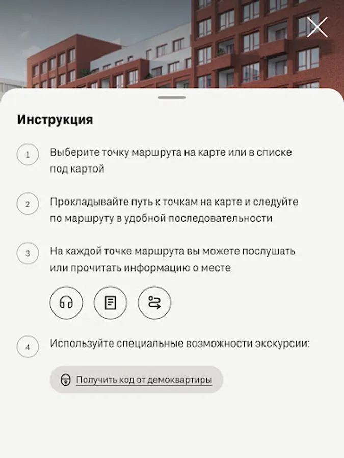 Go for a walk through the ready-made houses of Brusnica with an audio guide or take a virtual tour without leaving your home. During the route, we will go to the courtyard, the entrance and the demo apartment.