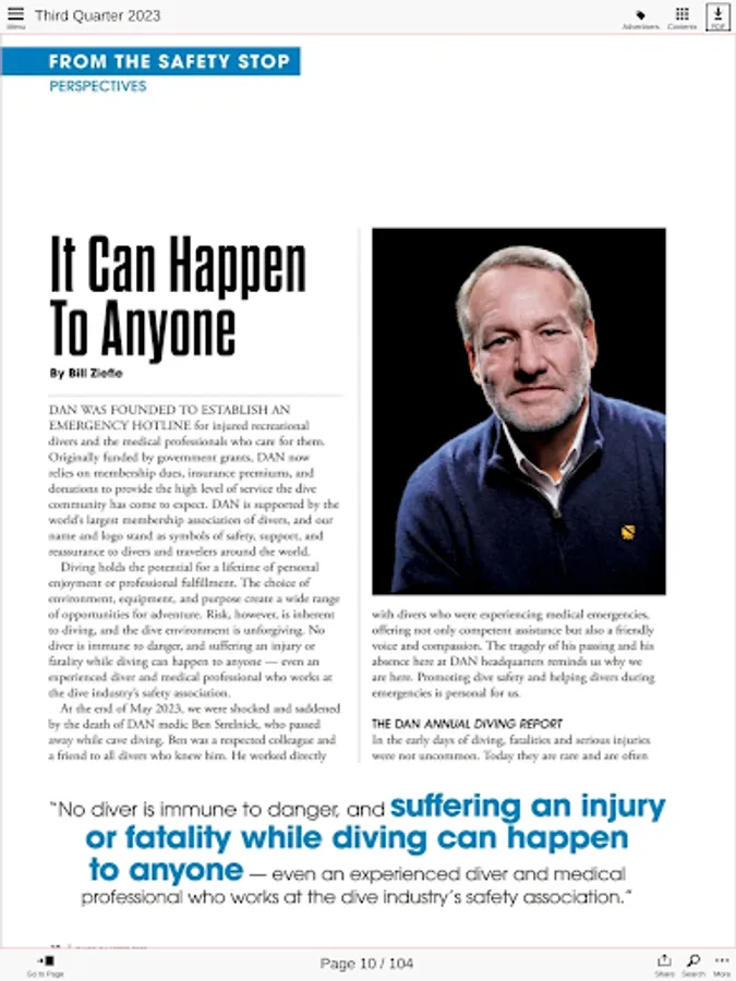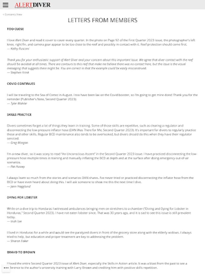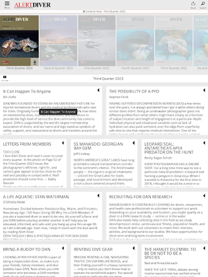 Published quarterly, Alert Diver is a benefit to members of DAN; its companion website, AlertDiver.com, is available to all. If you are a current DAN member (DAN America region), everything offered in this app is included in your membership and free to you!