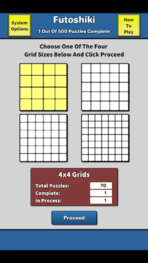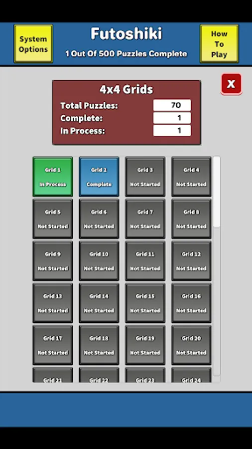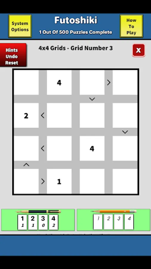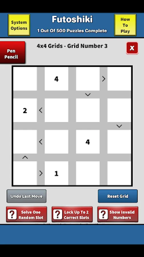 Each puzzle has a handful of presolved squares and also has a number of posted inequalities that must be honored.