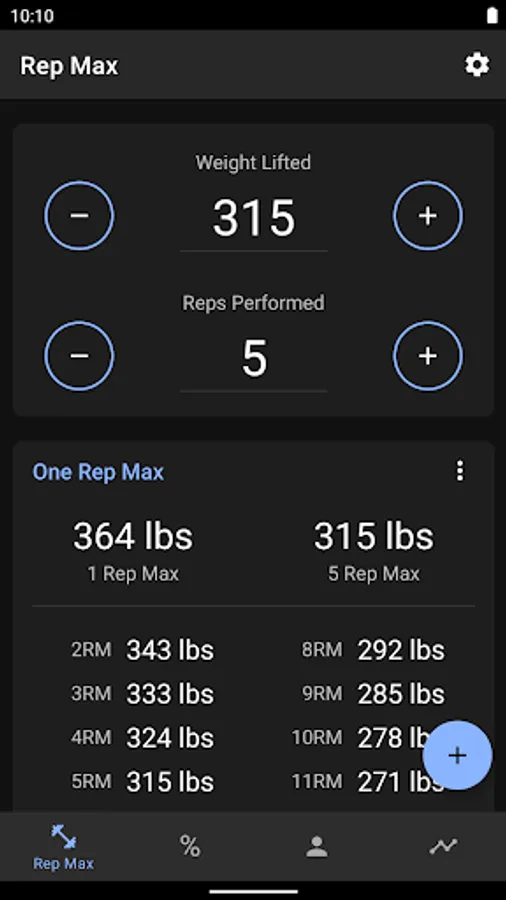 1 Rep Max Calculator is a must have app for every weight lifter. It calculates the maximum weight that you can lift for 1 repetition given information that you already know. Just enter the weight and reps that you were previously able to achieve and let the calculator do the rest! It can also be used to calculate the percentages of your one rep max and your Wilks Score.
