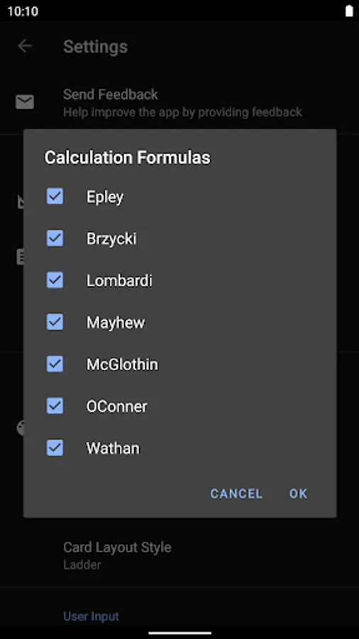 There are many 1 Rep Max formulas to choose from: Epley, Brzycki, Lombardi, Mayhew, McGlothin, OConner, Wathan. You can choose just a single formula or get an average of the ones you select.