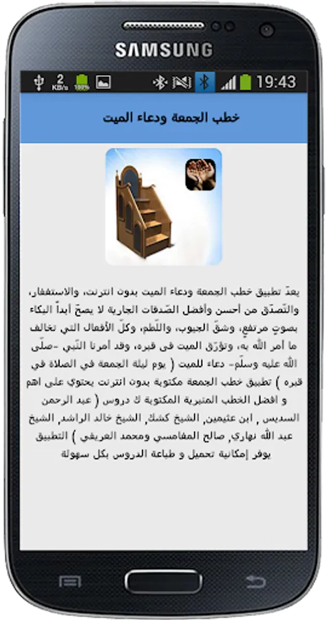 The application of Friday sermons written without the Internet contains the most important and best written sermons written as lessons (Abdul Rahman Al-Sudais, Ibn Uthaymeen, Sheikh Kishk, Sheikh Khaled Al-Rashed, Sheikh Abdullah Nahari, Saleh Al-Maghamisi and Muhammad Al-Arifi) The application provides the ability to download and print lessons with ease