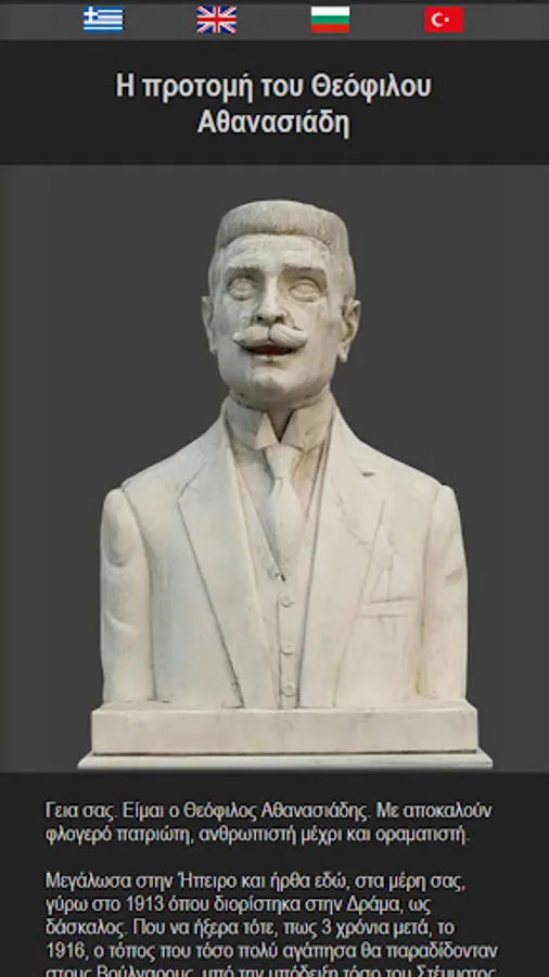 Statues come alive! By scanning a QR Code on their base, 20 Drama statues come alive and talk. The statues tell the story of the people they depict and their relationship with the city of Drama, while the works of modern sculpture come alive by interpreting the reasoning of their artist/creator.
