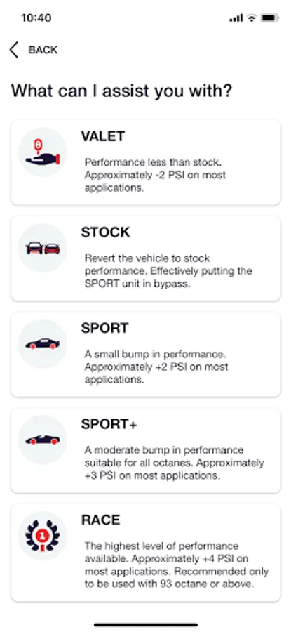 Turn down your boost for fuel savings or valet parking, or increase it to boost your engine's power output. The control panel allows the user to chose between 5 power settings as well as monitor live boost pressure and peak boost pressure using your phone.