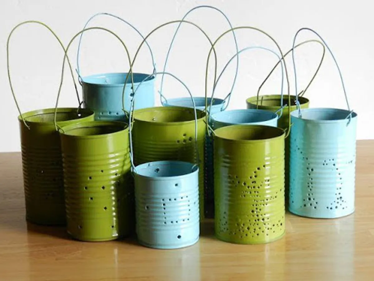 Cleaned cans or cans of vegetables can be used for various handicrafts. If you fill it with water, and let them freeze in the freezer, you can punch a hole in the side of the tin using a hammer and nail (the ice inside makes the structure and keeps it from clinking). Holes can be punched to form designs. The outside of the can can be painted and if there is a tea light, they make a beautiful figure. These can be hung on the porch, lined up along the driveway for a party, or used inside the house as a beautiful decoration.
