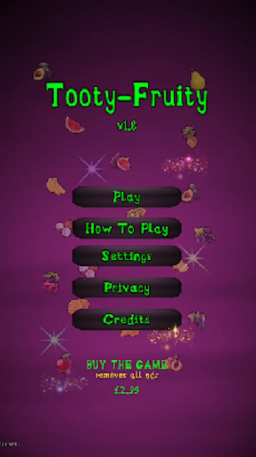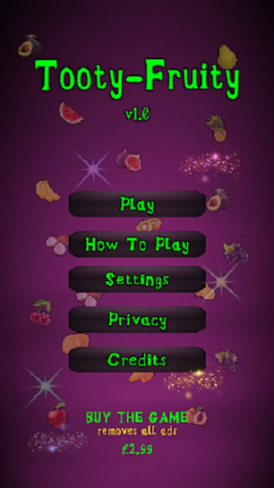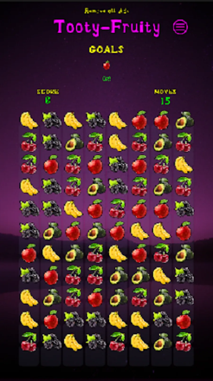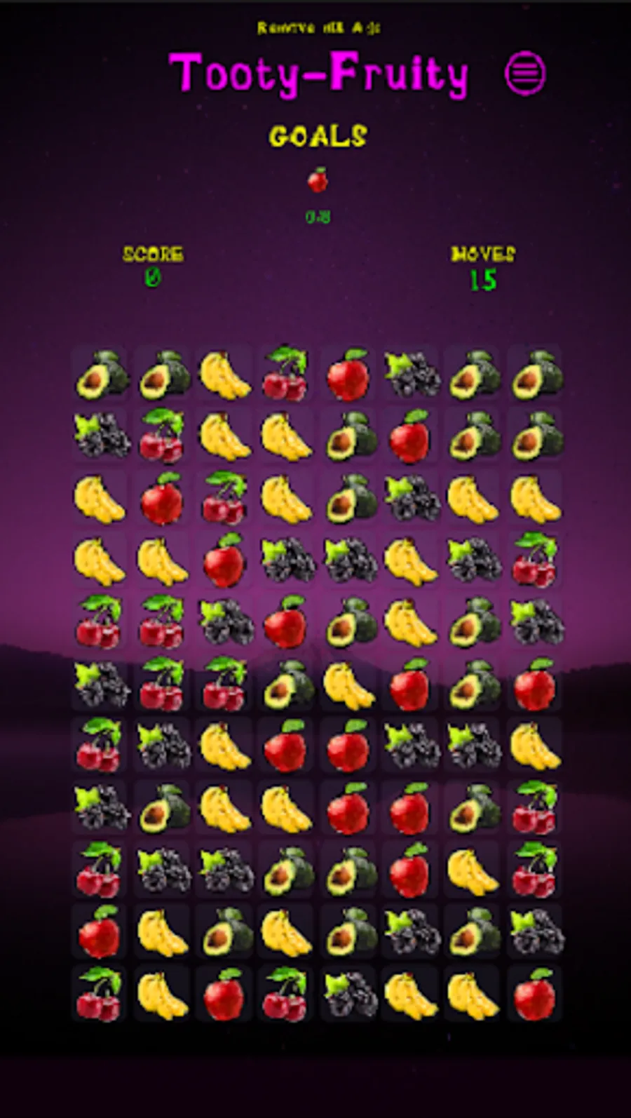 A match-3 game that increases in complexity through each level consisting of various fruit, fruit-skin breakable tiles and nasty fruit flies that intend to infest. As more levels are unlocked, new fruits become available. Complete all levels to unlock "All You Can Eat" and become the next fruit star!