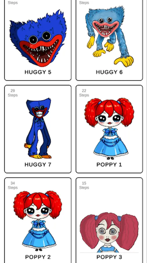 How To Draw Huggy is a free educational app that lets you draw your favorite and familiar characters on paper. With it, you can easily draw the characters of the game familiar to everyone! The application How to draw Huggy and Poppy step by step has a very simple and clear control, you will understand it without any problems.