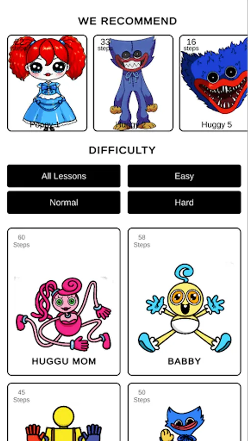 What to do in the application? First, choose the character you would like to draw. Before that, do not forget to take a piece of paper, a pencil and laundry. After choosing a hero, start the lesson! Repeat all the steps that are given in the lesson, and you will draw the selected character without any problems. Believe me, you do not need experience and skills in drawing. Everything will work out! Step by step follow the lessons of the application How to draw Huggy and Poppy step by step and the result will not be long in coming!