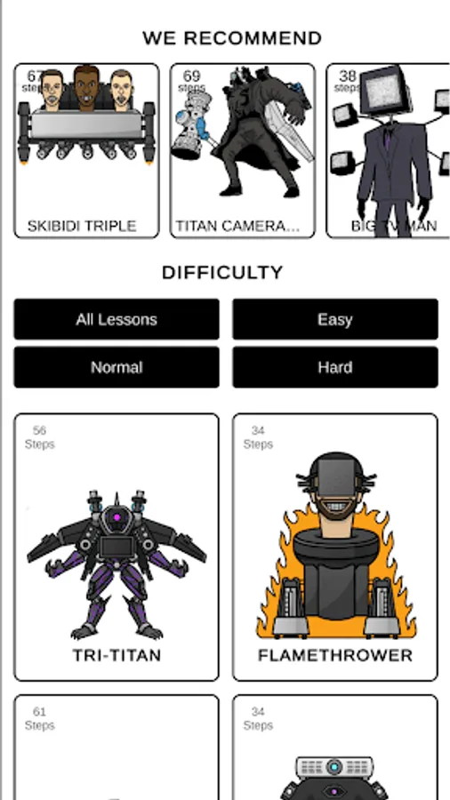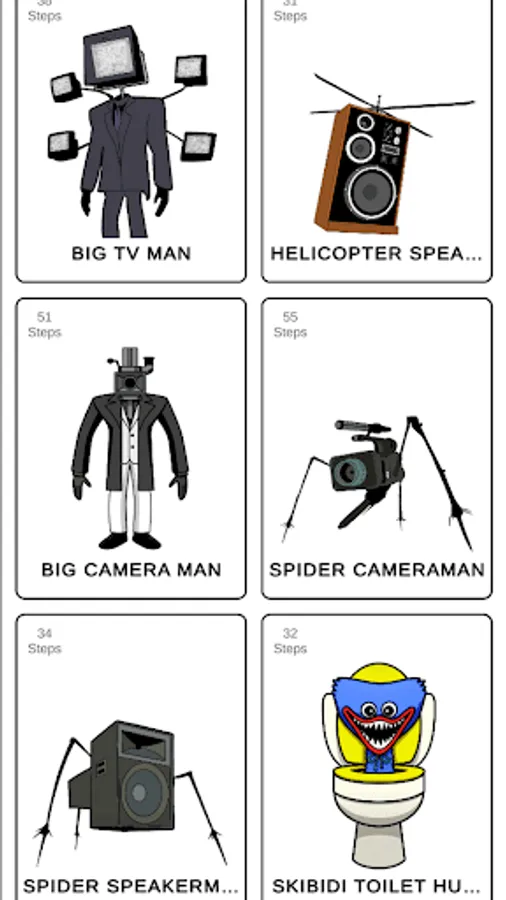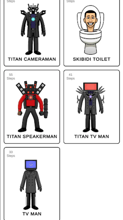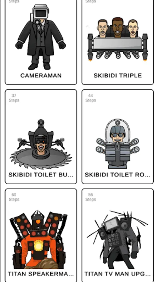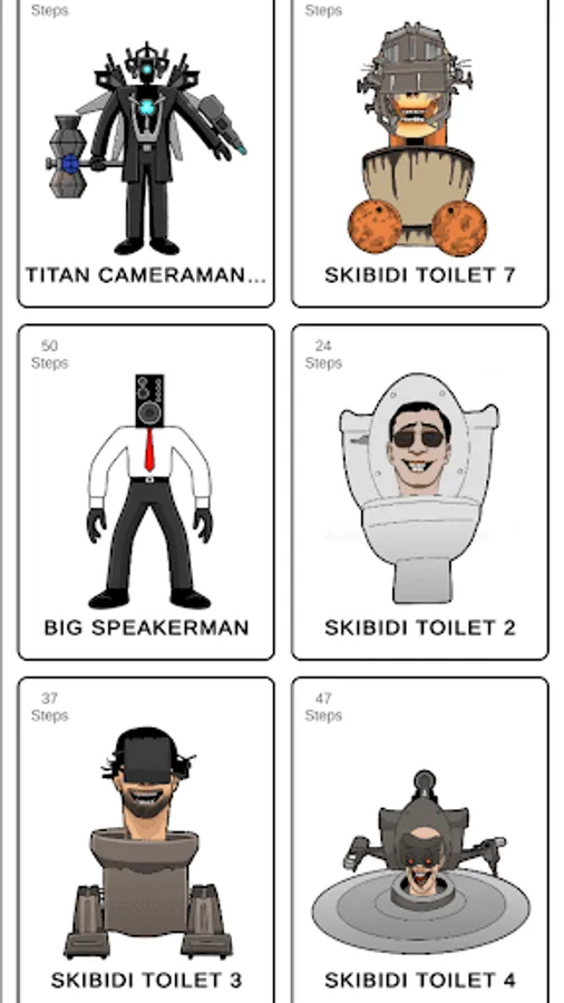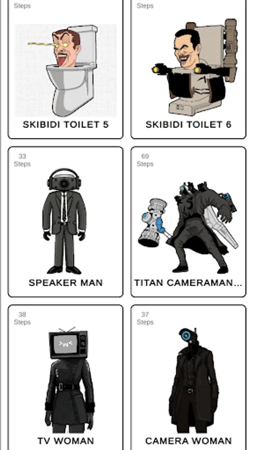 What to do in the application? To get started, select the character you want to draw. Before that, do not forget to take a piece of paper, a pencil and laundry. After choosing a hero, start the lesson! Repeat all the steps that are given in the lesson, and you will easily draw the selected skibibi toilet cartoon character. Believe me, you do not need experience and drawing skills. Everything will work out! Follow the lessons of the application How to draw skibibi toilet step by step and the result will not be long in coming!