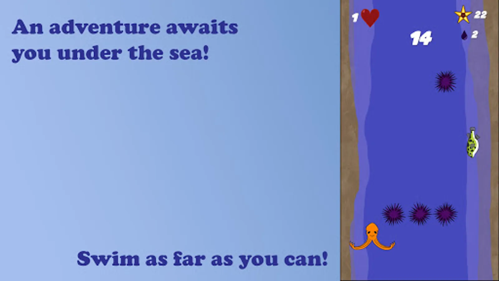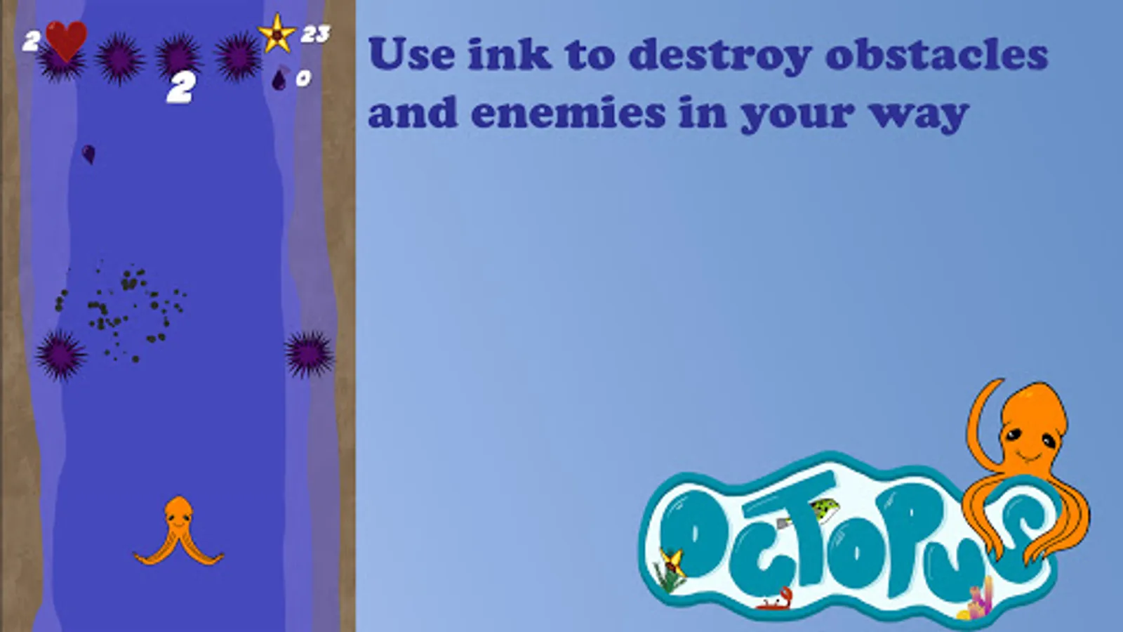 In the vast ocean, a little octopus was spending its day collecting starfishes but on one faithful day, the vacuum opened up in the deep deep depth and sucked the little octopus inside. Now in the depth of the ocean, the octopus will have to survive and try to swim its way out of there. The vacuum has woken up other dangerous sea creatures and these creatures will hunt the octopus down. Swim up, avoid obstacles, blind all of your attackers and collect as many starfishes as you can.