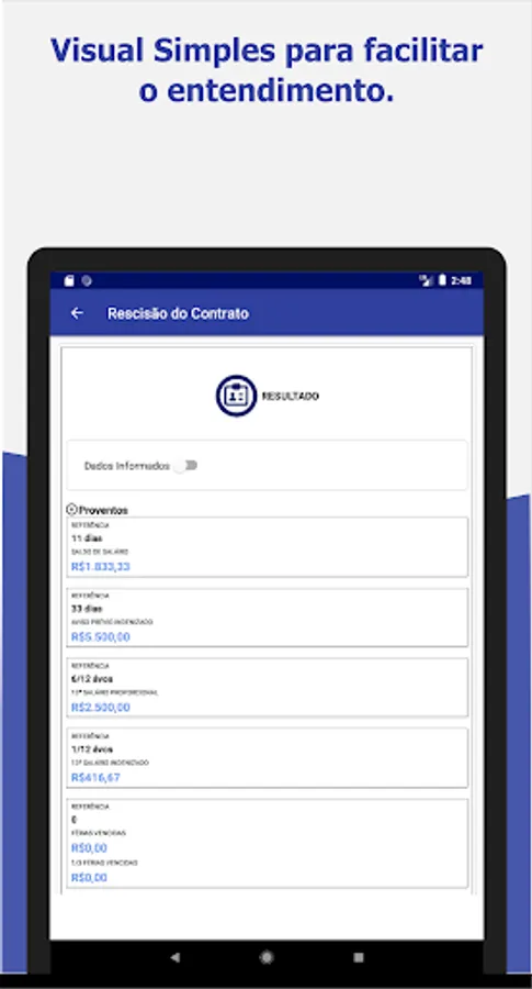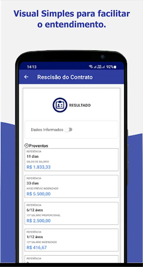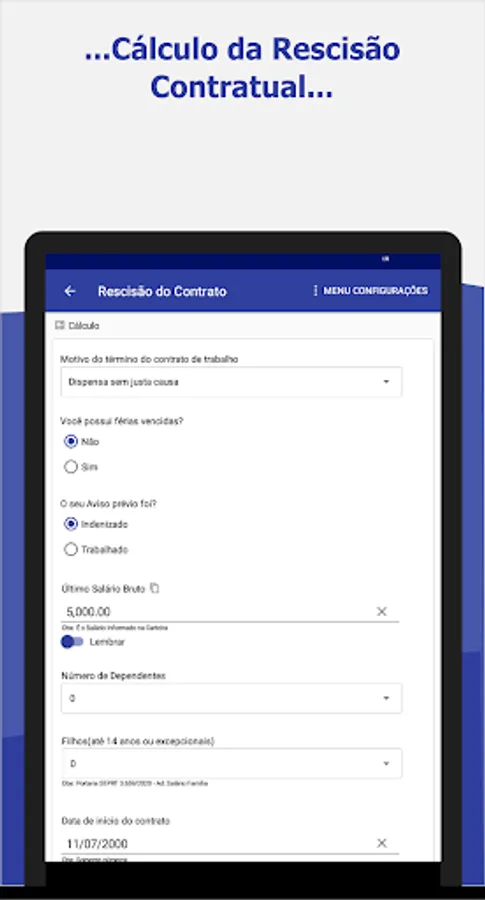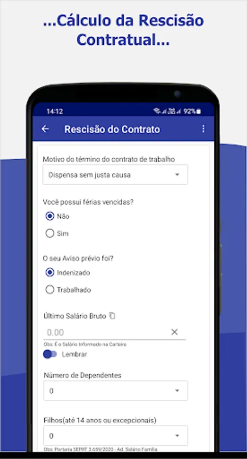 - Calculation of Employment Contract Termination - Simulation of receipts, benefits, vacations, 1/3 of the thirteenth, discounts and earnings.