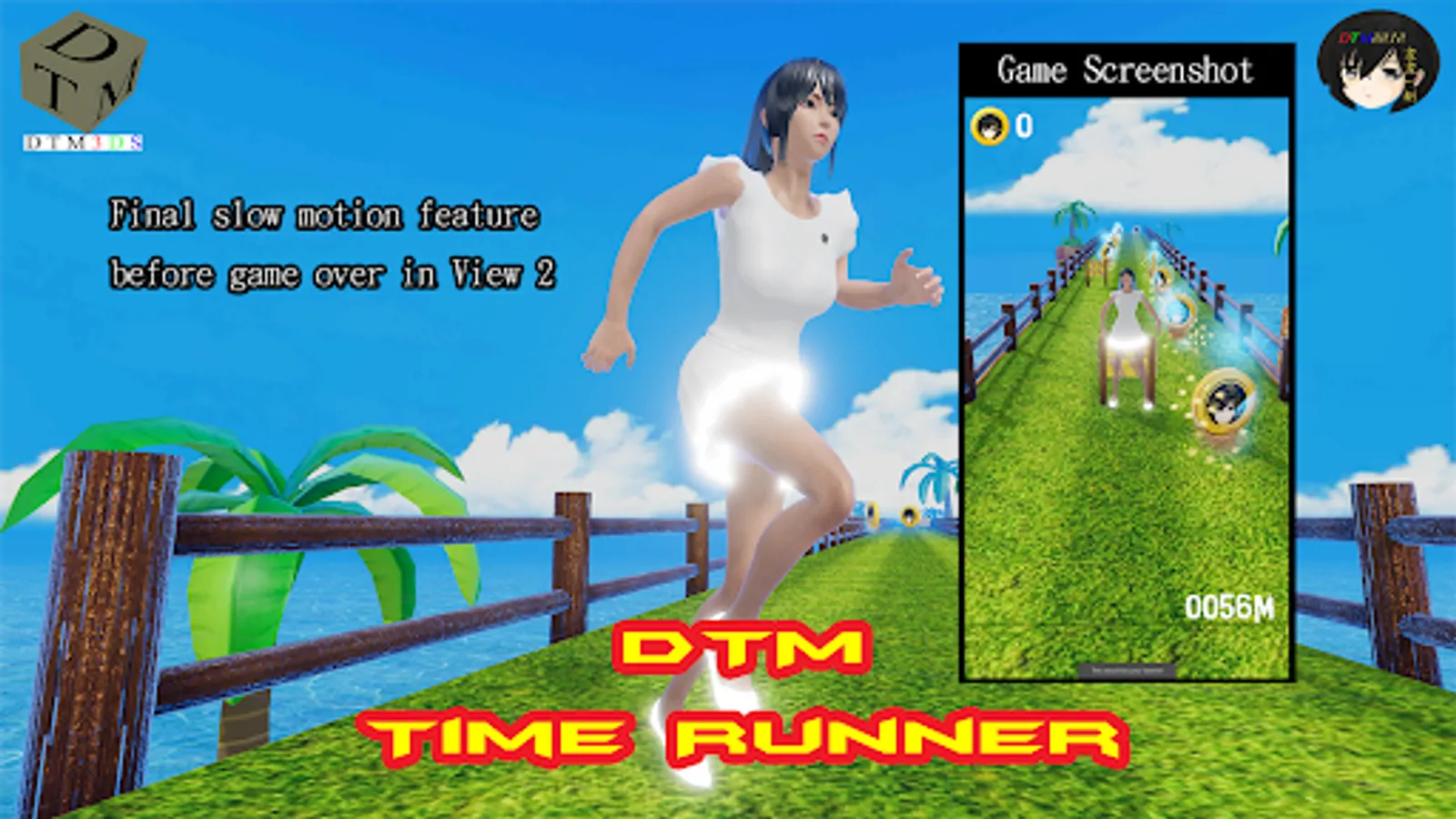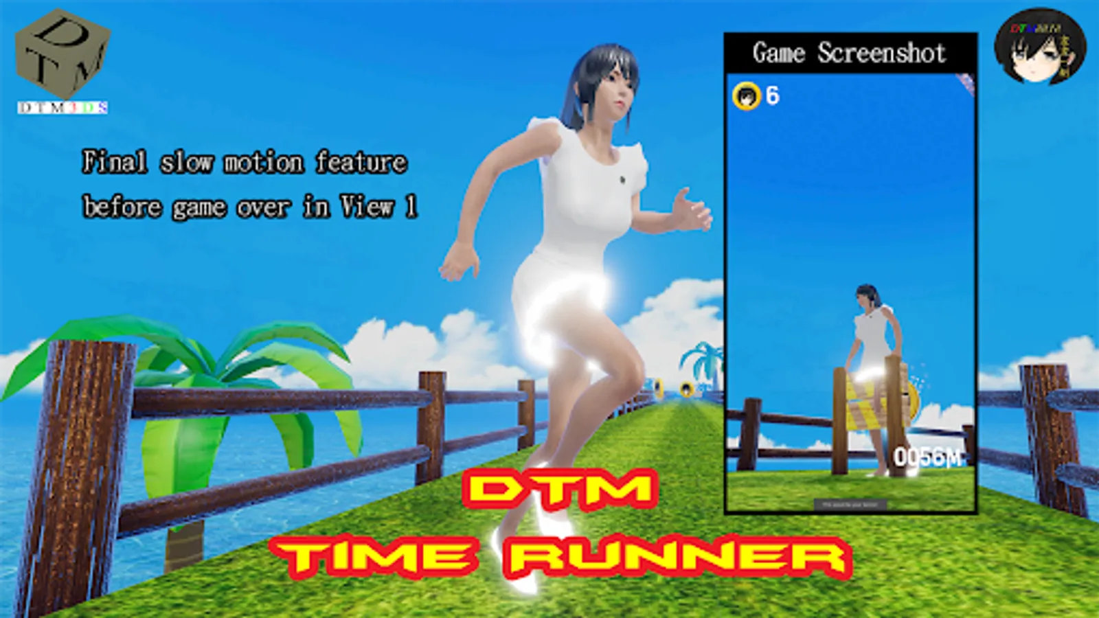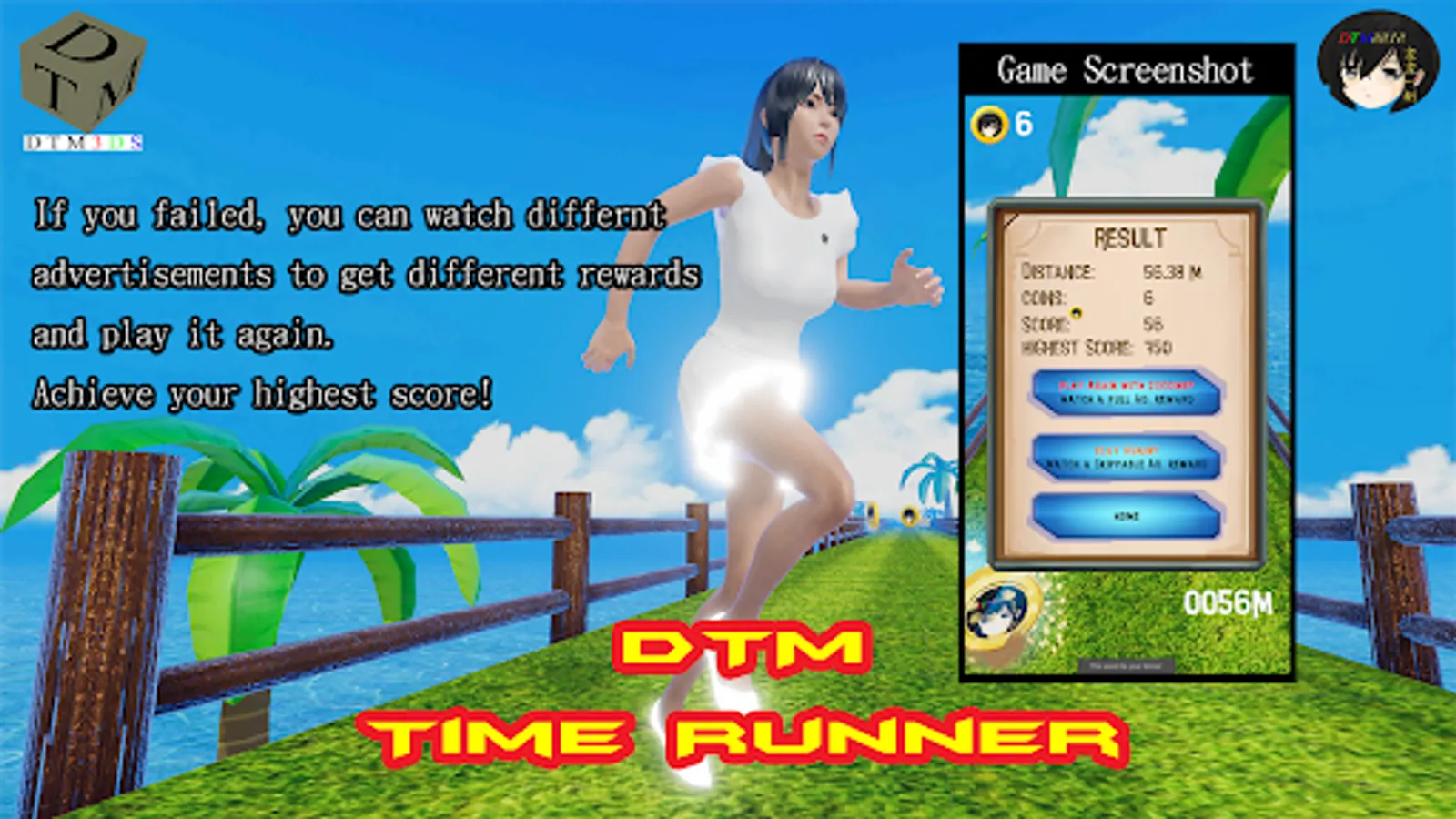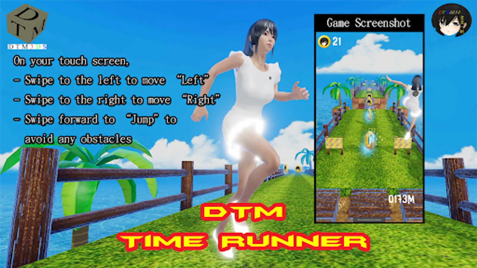 This is an action-time runner game for play and a YouTube demo if need. On the console screen, you can swipe your finger to the left to move "Left", swipe your finger to the right to move "Right", and swipe your finger to the forward to "Jump" in order to avoid any obstacles. During the game, you can collect the DTM coins to get a higher score. You may watch advertisements to get different rewards. If you failed, you can watch a skippable advertisement to play it again. If you want to collect double coins, you can watch a full advertisement to play it again. We may update this game for more fun in the future. Enjoy and have fun! It is wonderful to have you here.