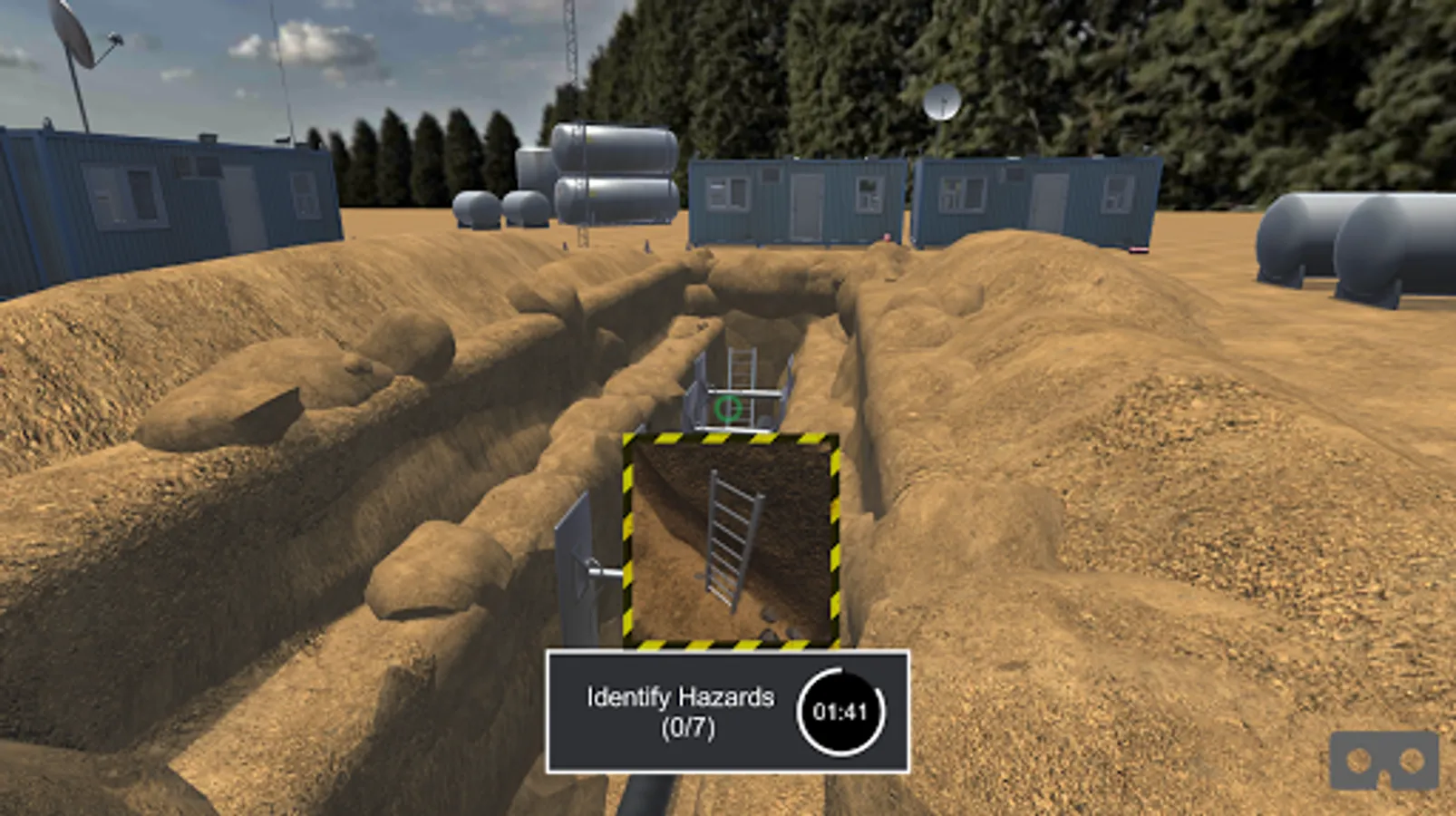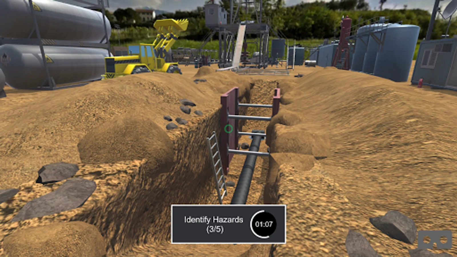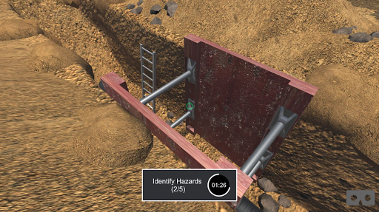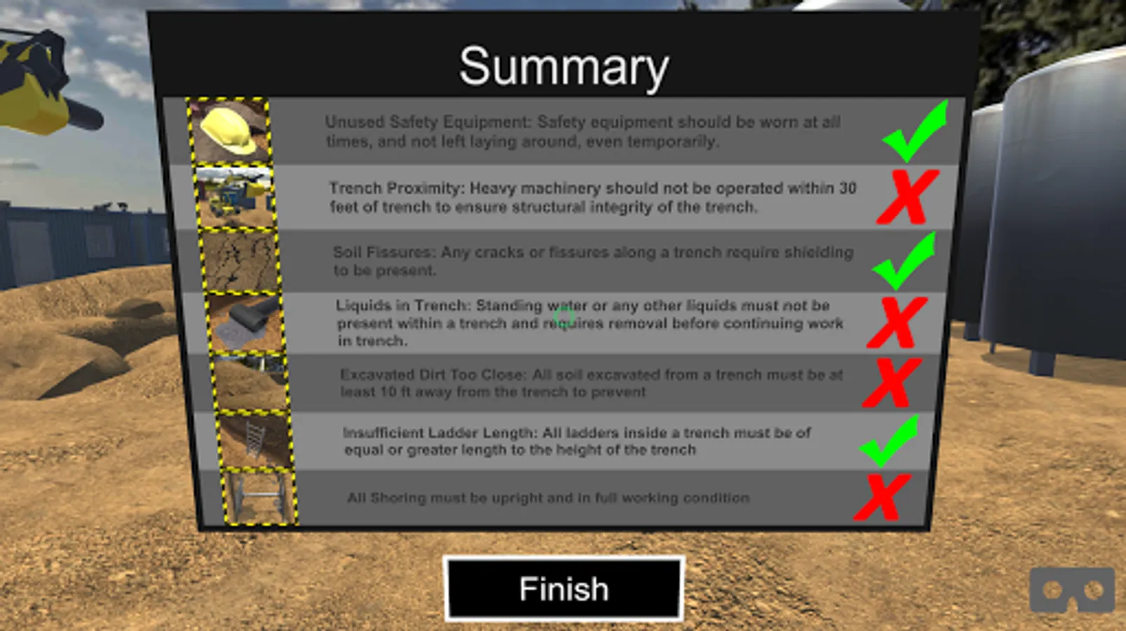 This app will address common hazardous conditions found in 3 different trench styles and include overhead hazards as well. A scorecard is compiled at the end of each VR scenario to evaluate that all hazards have been identified. We recommend that the app should be used as a supplement to an in-house training course to emphasize the learning objectives of safely assessing a trench for potential hazards.