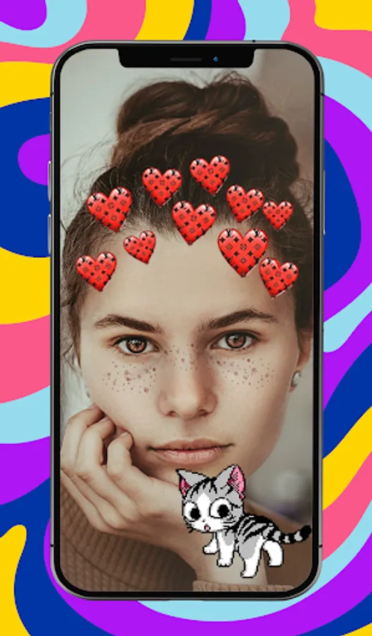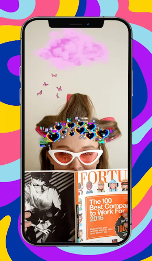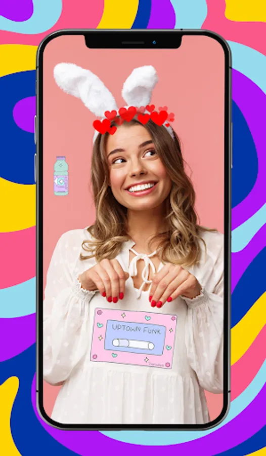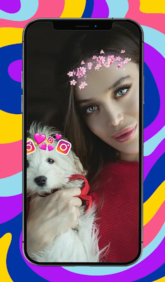 Add funny snappy face effects, puppy doggy face, rainbow effect, cute rabbit, lenses tears, Fancy, tag text, stickers and emojis, 3D masks, flowers crown, Fancy text and more... to your selfie in just a few seconds!
