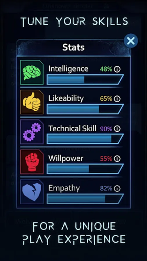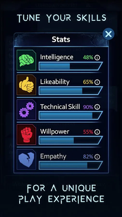 - Shape the story and build stats in 5 categories. Success or failure depends on your stats!