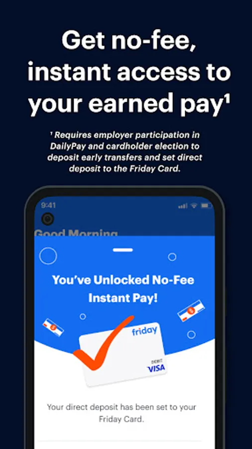 ¹ Requires employer participation in DailyPay and cardholder election to deposit early transfers and set direct deposit to the Friday Card.
