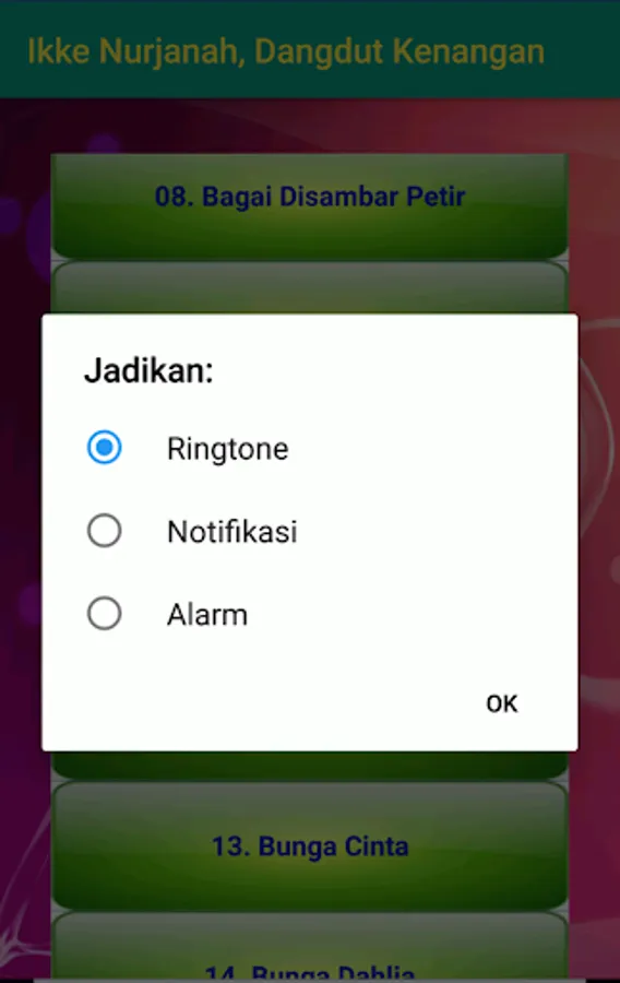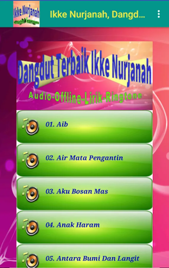 Dangdut Kenangan: Ikke Nurjanah is part of the Dangdut Kenangan song series, dangdut nostalgia for the Dangdut diva homeland. Contains the most popular and best collection of singer Ikke Nurjanah dangdut. Install and enjoy quality audio from Ikke Nurjanah's songs such as Lips and Hearts, Fantasy of the Past, Bride Tears, Alit Bracelets, and others. Old Dangdut Ikke Nurjanah is equipped with song lyrics as well as random play functions, play all songs, and ringtones. Can still be enjoyed even without internet connection (offline).