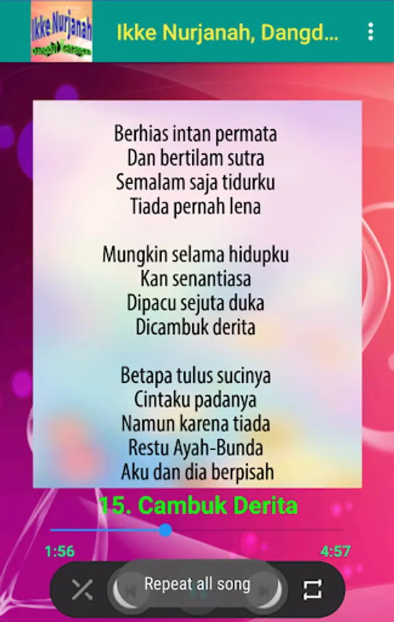 * Song lyrics. All Dangdut Songs are equipped with song lyrics making it easy to understand and participate in singing each song.