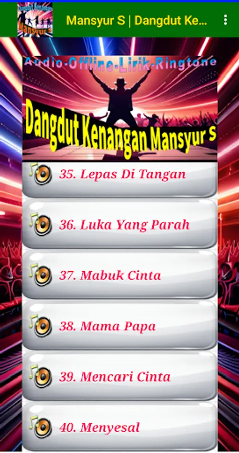 Jelajahi kembali kenangan indah dengan mengunduh "Dangdut Kenangan Mansyur S" sekarang juga. Rasakan romantisme dan pesona musik dangdut legendaris dari Mansyur S dalam genggaman Anda.