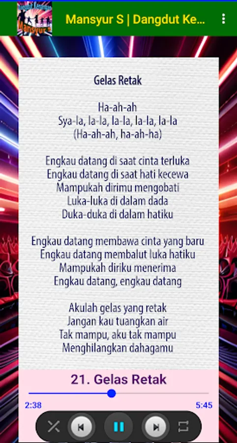 App ini dilengkapi dengan lirik dari setiap lagu, memungkinkan Anda menyanyikan setiap bait dengan penuh perasaan. Dengarkan dan rasakan setiap kata yang dinyanyikan oleh Mansyur S, sehingga Anda dapat terhubung lebih dekat dengan lirik yang penuh makna.