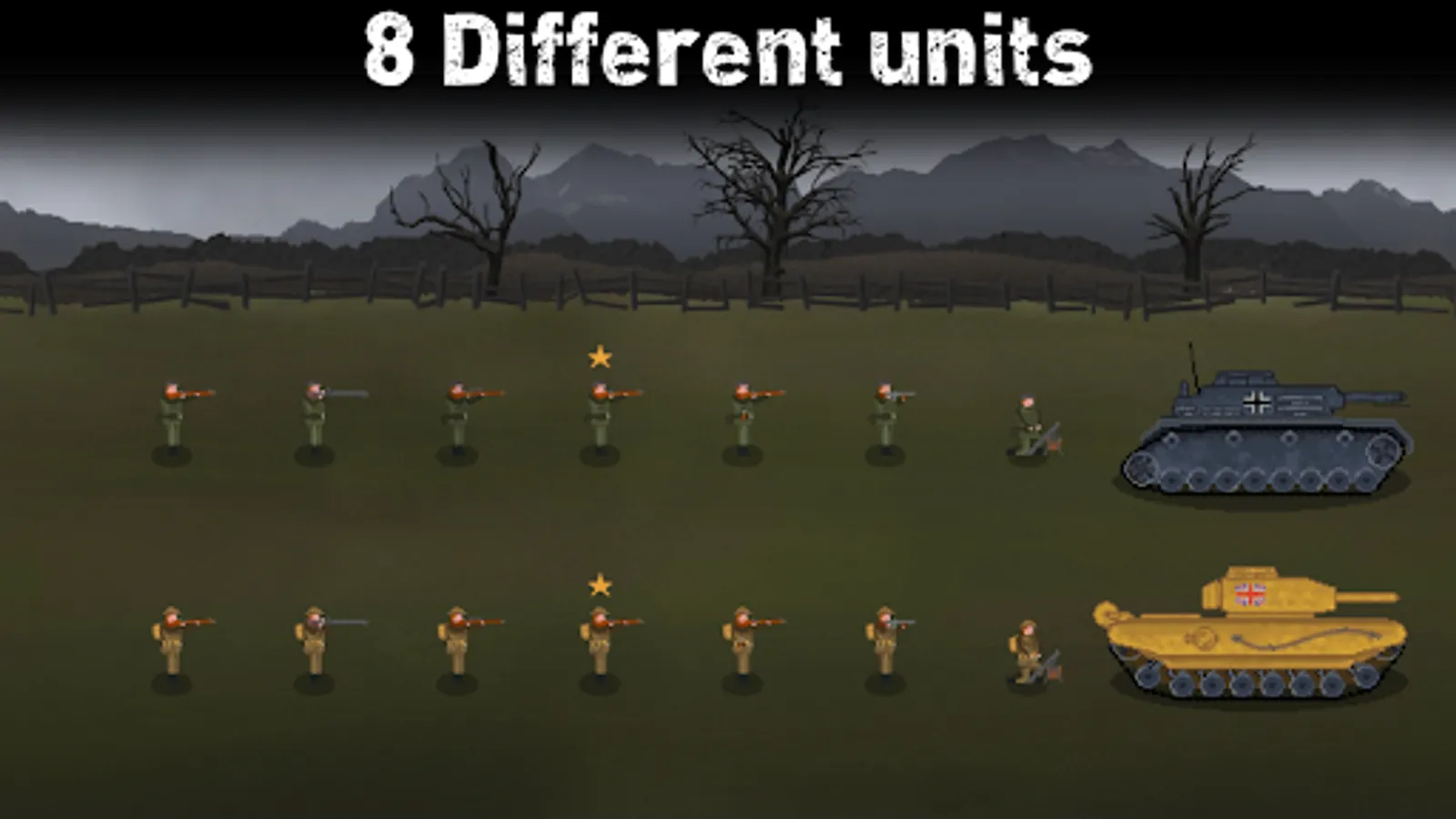 Make strategic decisions while being in control of up to 10 different units and abilitys. Lead your army into battle with riflemen, mortars, planes, tanks and many more units.