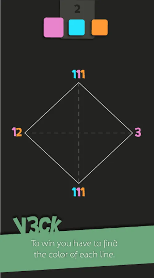 To achieve V3ck, you must complete each brain teaser by finding the color of each line, helping you with the numbers located on the tops. The numbers represent lines starting from the tops, and their color! The logic is easy to understand but the level difficulty will increase in each level!