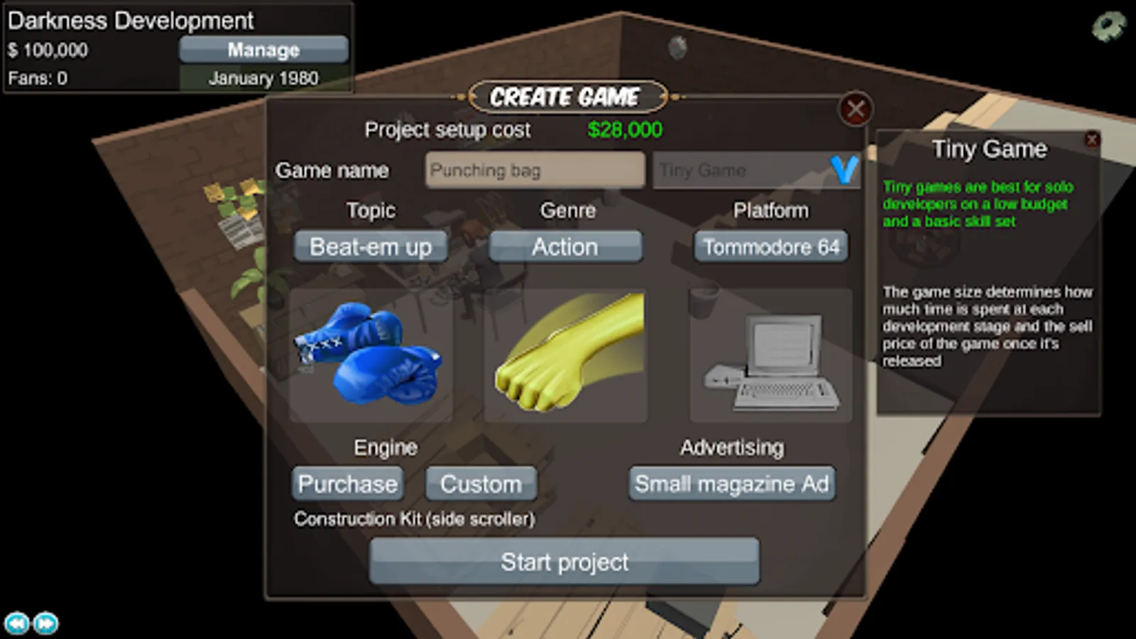 From the humble beginnings of programming alone in the basement, build up your company by employing and training new workers, researching new technologies and dominating the market with hit games of your design.