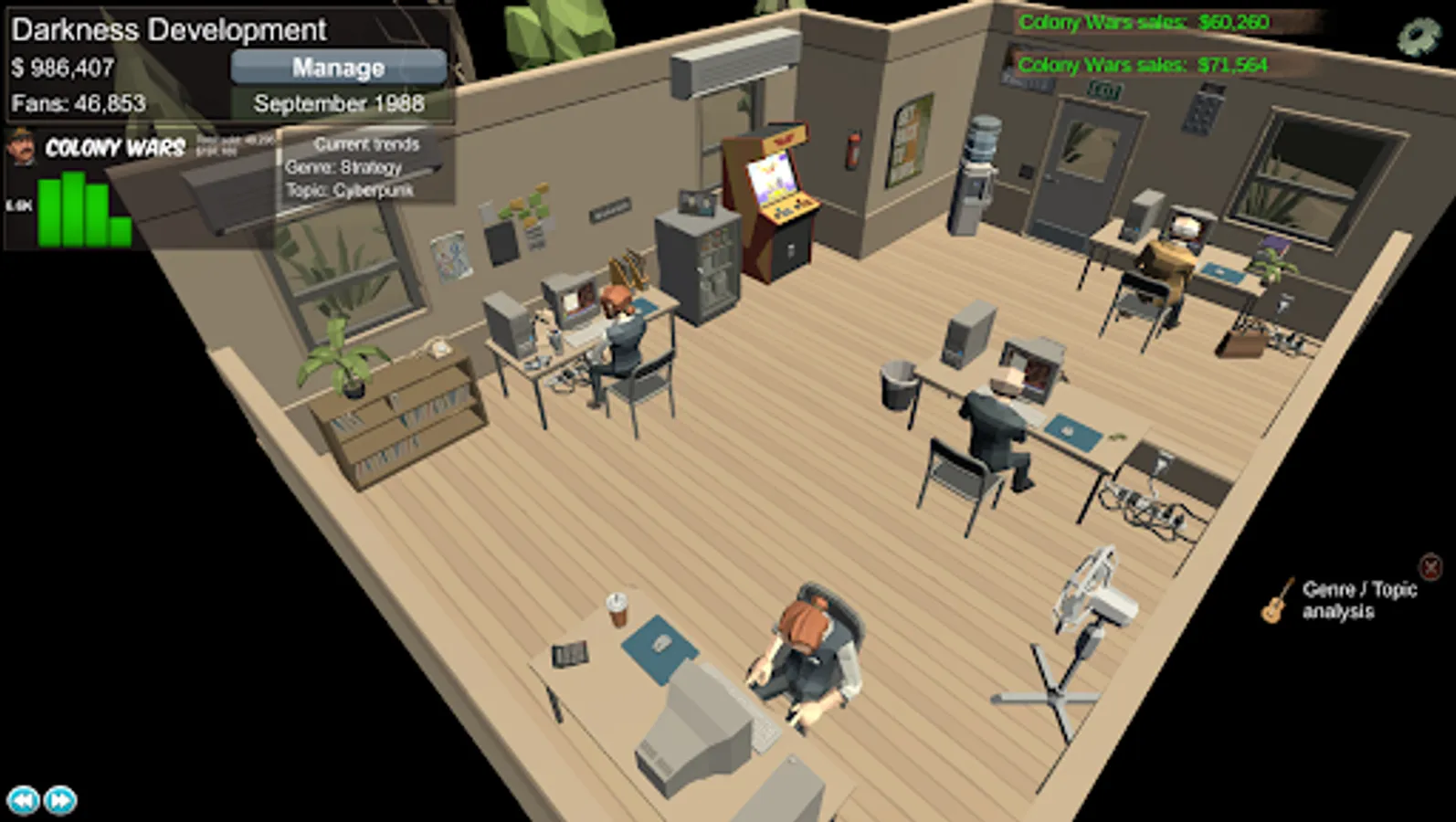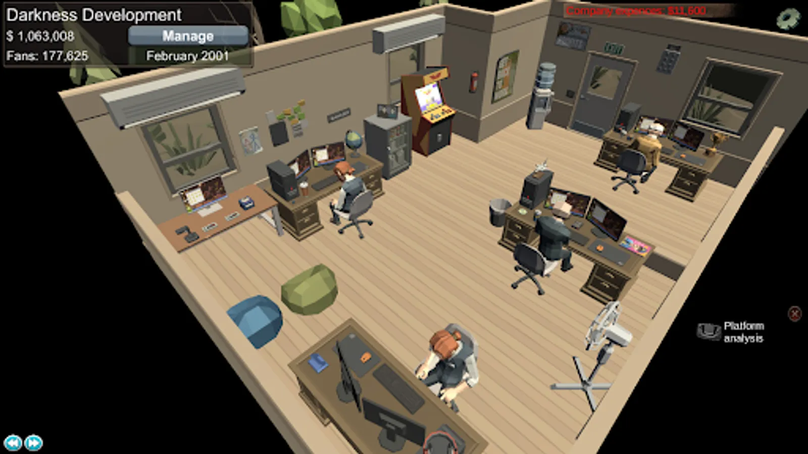 Decide how much time your workers should spend on each aspect of game development, Include features that are relevant to your chosen genre and topic and be rewarded with great reviews, high sales and happy fans.