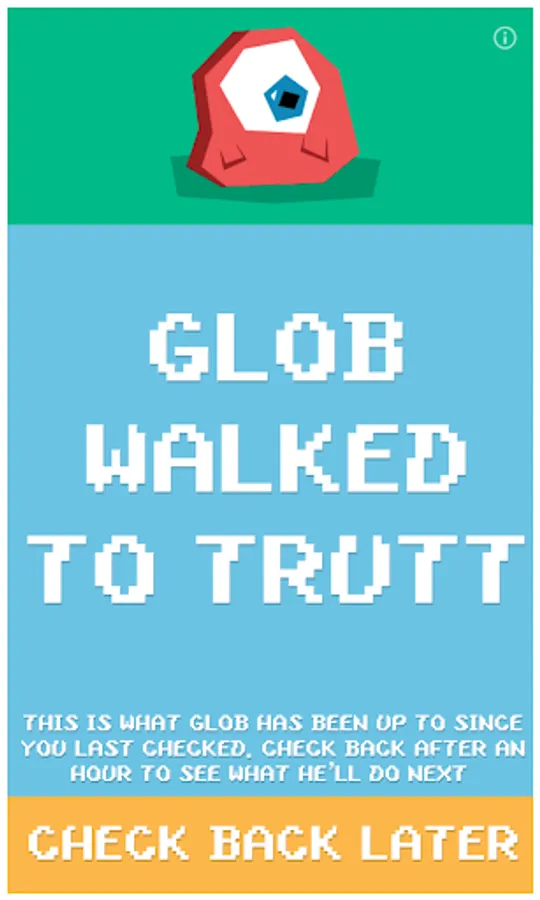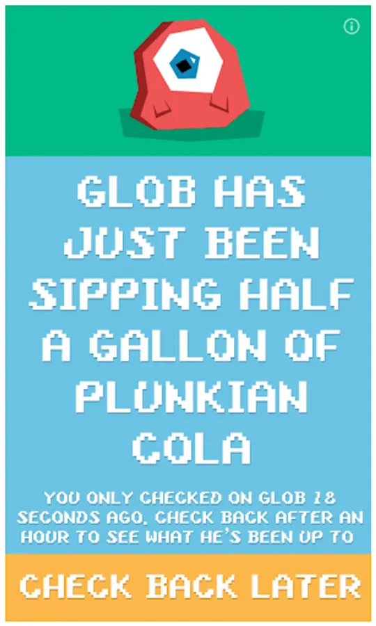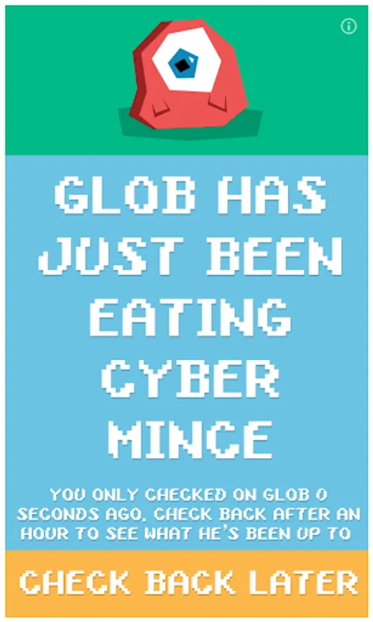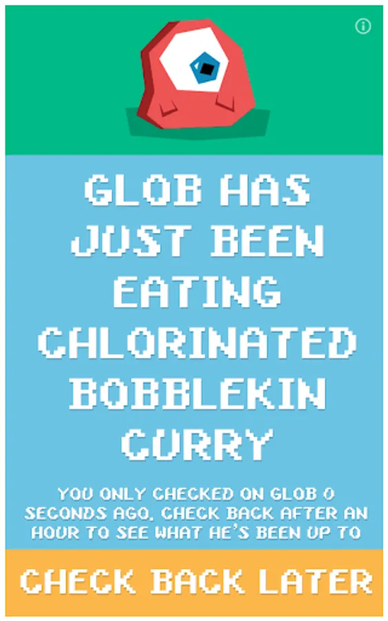A random nonsense generator, which tells you what Glob has been up to since you last checked on him. If you check up after an hour, he'll have been doing something more interesting than if you check after a just a few moments.