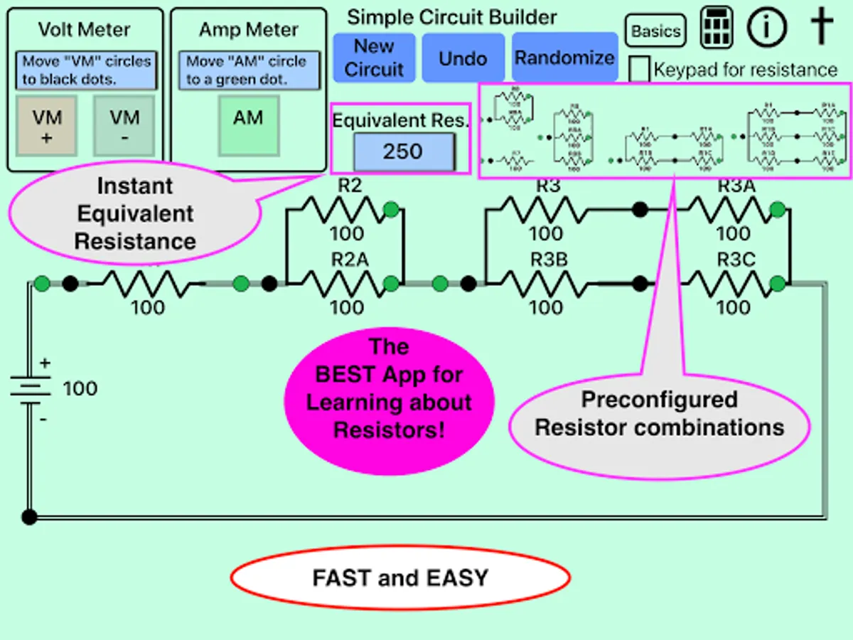 This is the BEST app to learn about Resistors and Equivalent Resistance. This virtual lab provides an excellent environment for anyone who is interested in understanding series and parallel resistors, learning how to measure voltages across resistors, current through series and parallel circuits and solving simple circuits.