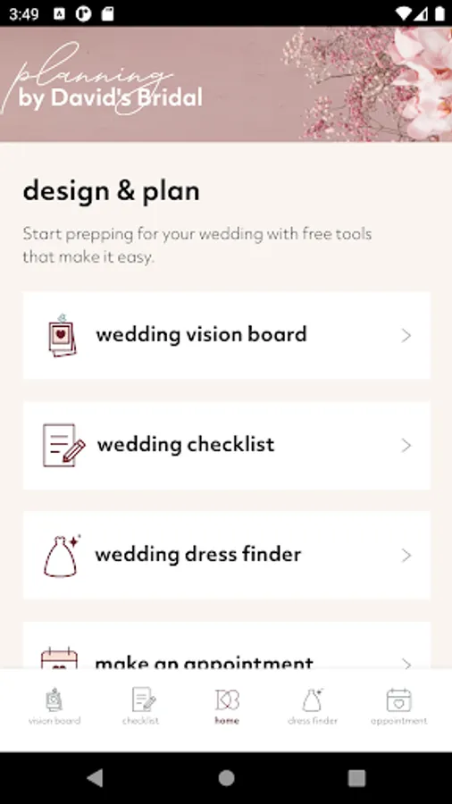 The Planning by David's Bridal app makes planning your wedding a whole lot easier by giving you all the tools you need to plan your wedding in a convenient, phone-friendly format. Create a vision board for your big day, cross off your to-do list, take style quizzes, and more.