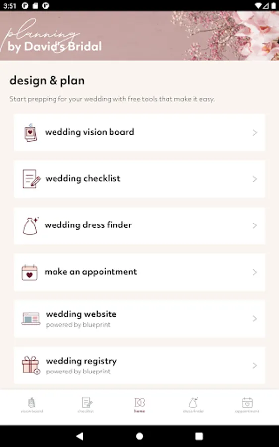 • Other Tools: Get quick access to shop everything from David's Bridal, and create your free wedding website and universal registry, powered by Blueprint.