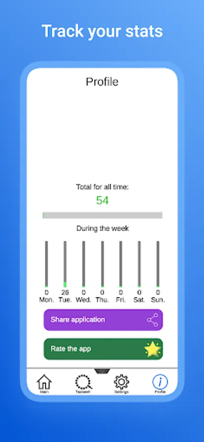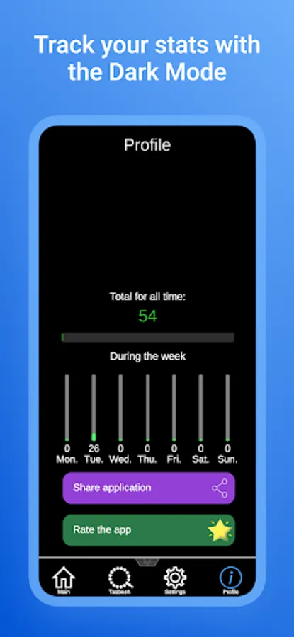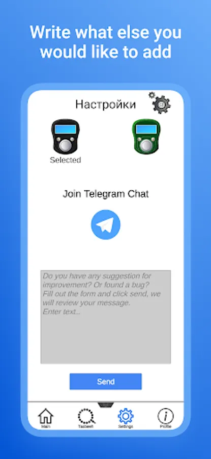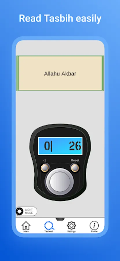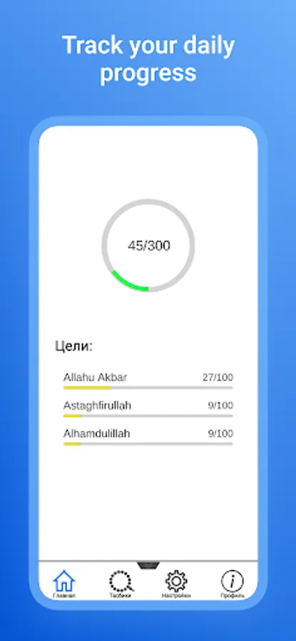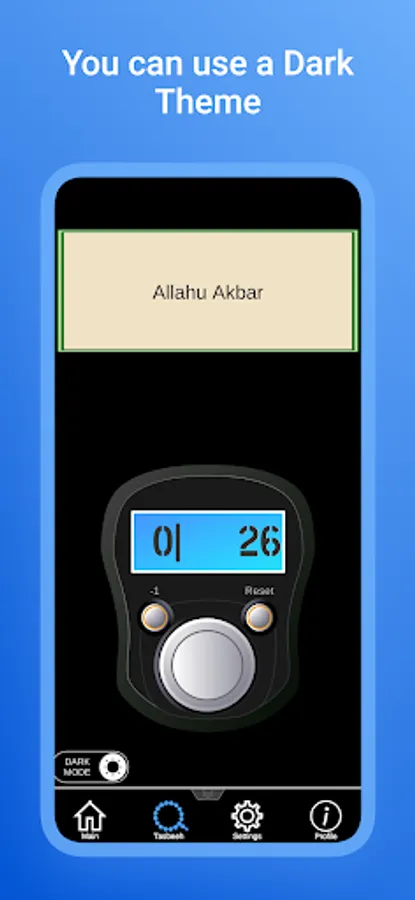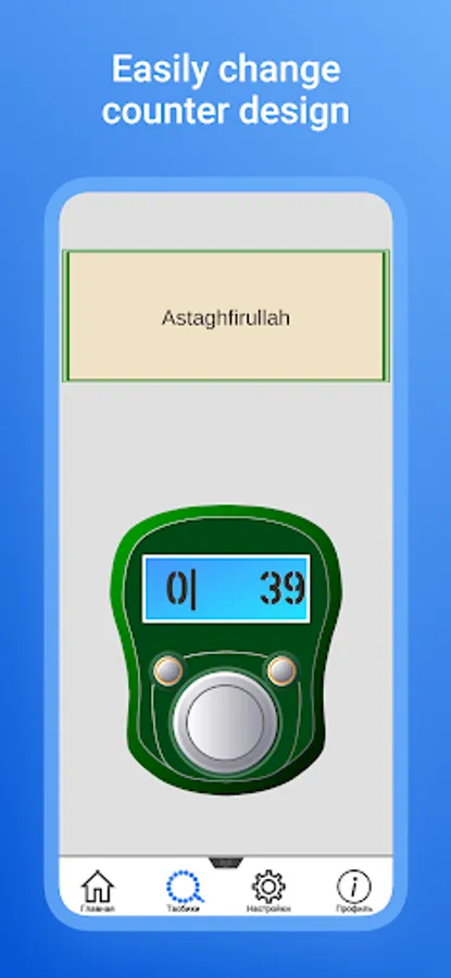 In the Menu tab there are 3 Dhikr, by selecting one of them a counter will open for you when the counter value reaches 100 vibration is triggered and the score is reset to zero. In the settings tab, a change in the design of the counter and a form for sending your suggestions and errors are currently implemented. In the profile tab, you can look at the total number of Zikrs and also view the statistics for the week.