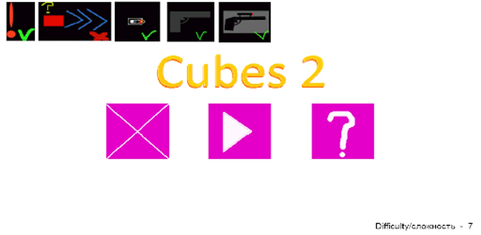 Cubes 2 is a game where you have to avoid running away from blue cubes and catching green ones, but something else. To control, you have to press. Where you click, the player will go there. Here you can adjust the difficulty, challenge yourself and get a lot of points. The more the difficulty, the faster the points are scored. To adjust the difficulty, you need to click on the buttons at the top of the main menu. They mean: the appearance of traps (exclamation marks), the change in the player's speed, the appearance of bullets, and so on. Traps work like this: when the trap is red, it can kill you, and when it is not red, you can not be afraid of it, although over time it will turn red.