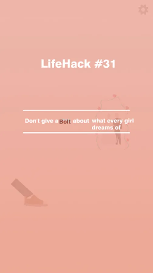 So what "Bolt - The Game" is? It's a game where you can put the bolt (don't give a ****) on different things and situations. At your disposal leg, bolt and a bunch of levels. Kick the bolts until they freeze in one position. Each level is a life hack for you, it consists of two stages, of varying difficulty. The game is complicated, but you are a professional in this, aren't you?