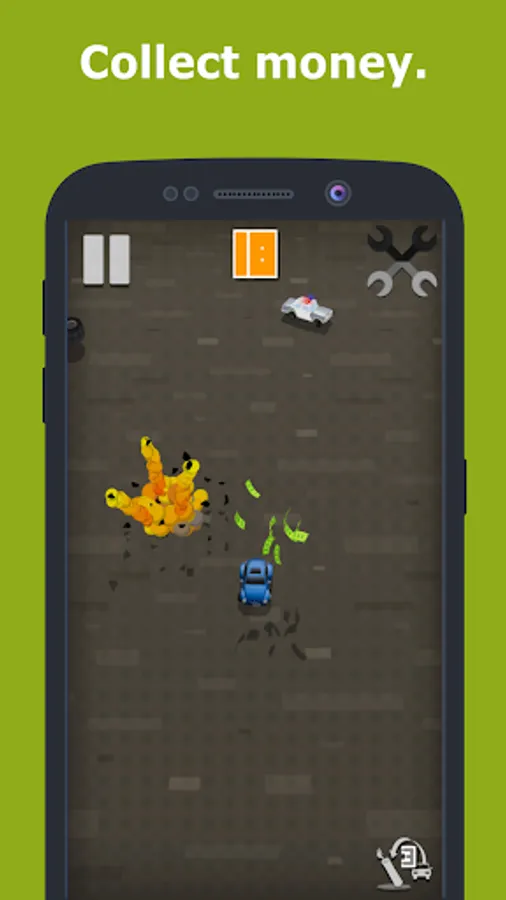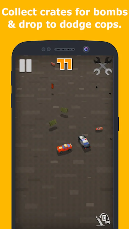 Collect crates for bombs and drop bombs to avoid the cops chasing your car. Collect tyres and fuel tanks to top up your car health. Also wrench will fully repair your car.
