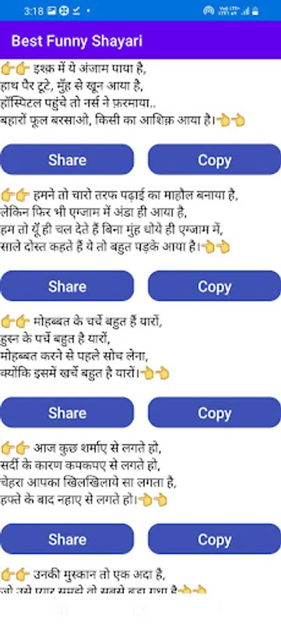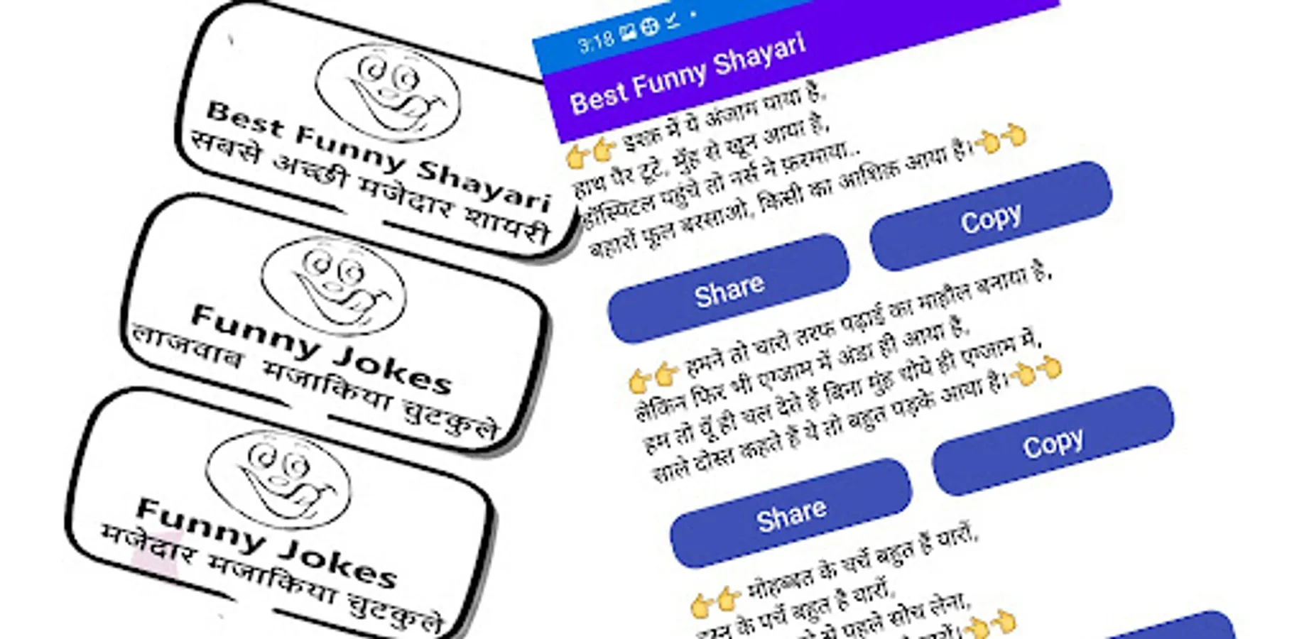 Funny Shayari App एक फ्री एप्लीकेशन है जिसे आप मोबाइल में Install करके कभी भी ऑफलाइन पढ़ सकते हैं। इस एप्लीकेशन में मुख्यतः दो बटन दिए गए हैं एक Share बटन और एक Copy बटन।