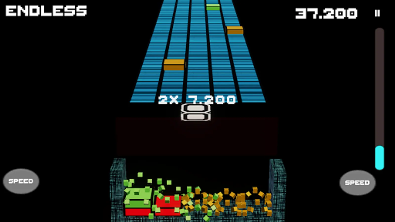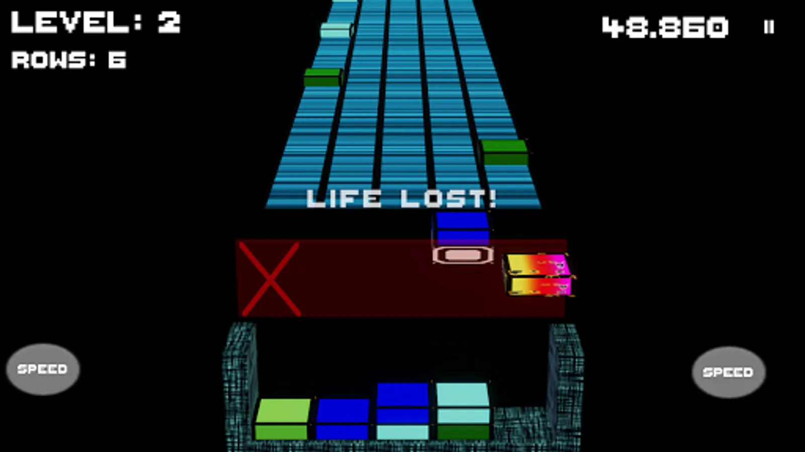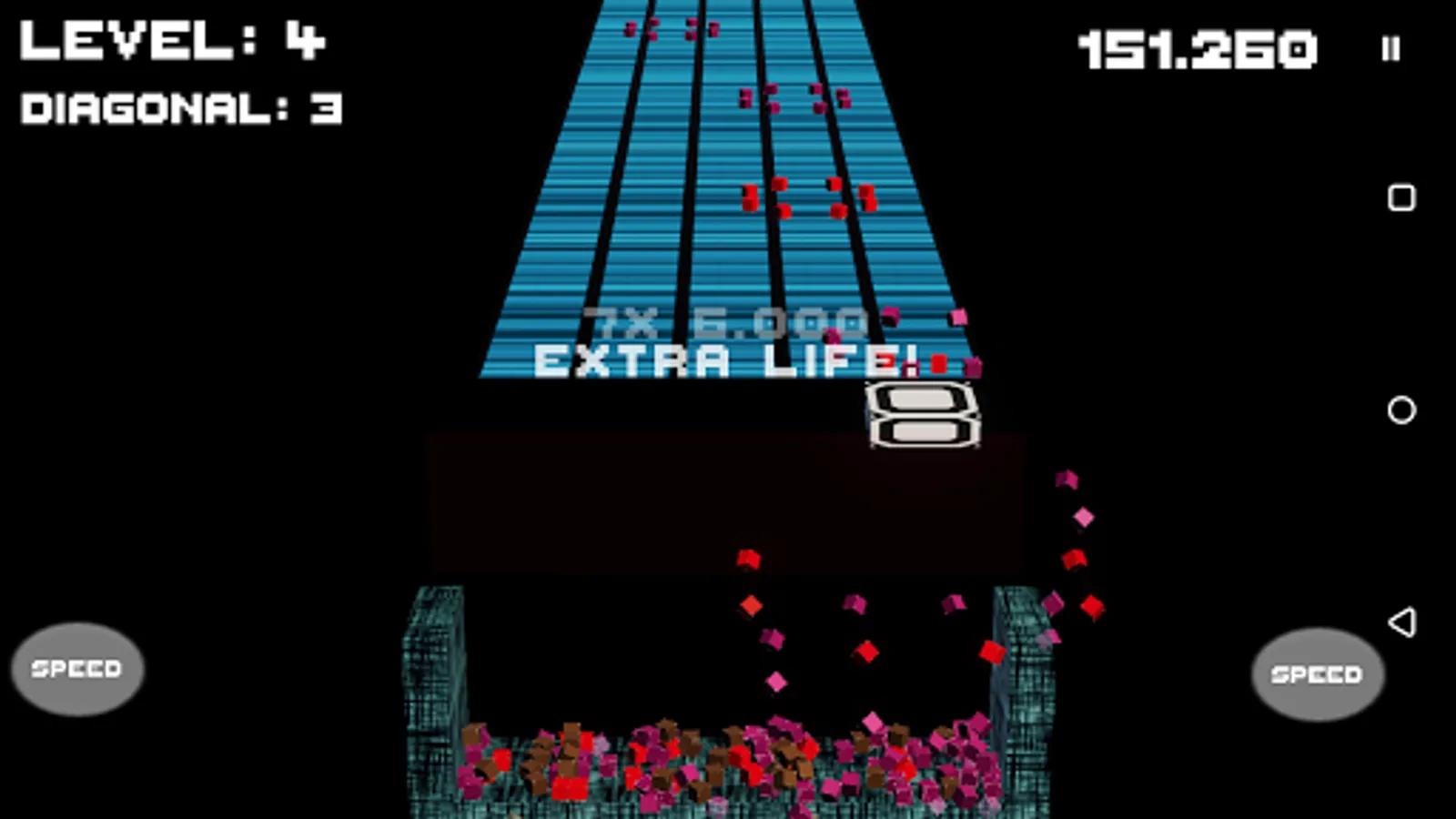 A conveyor belt carrys Cubes. You control a small platform that can catch those cubes. You can drop them the a box below. They are destroyed if three or more cubes are in a continuous line. The line can be horizontal, vertical or diagonal. Multiple lines destroyed simultaneously provide more points. You can either try to solve the goals of 'Level'-Mode, providing bonuses for every solved stage or test your skill in 'Endless'-Mode. The game is over if you missed too many cubes, filled up the box or solved all levels.